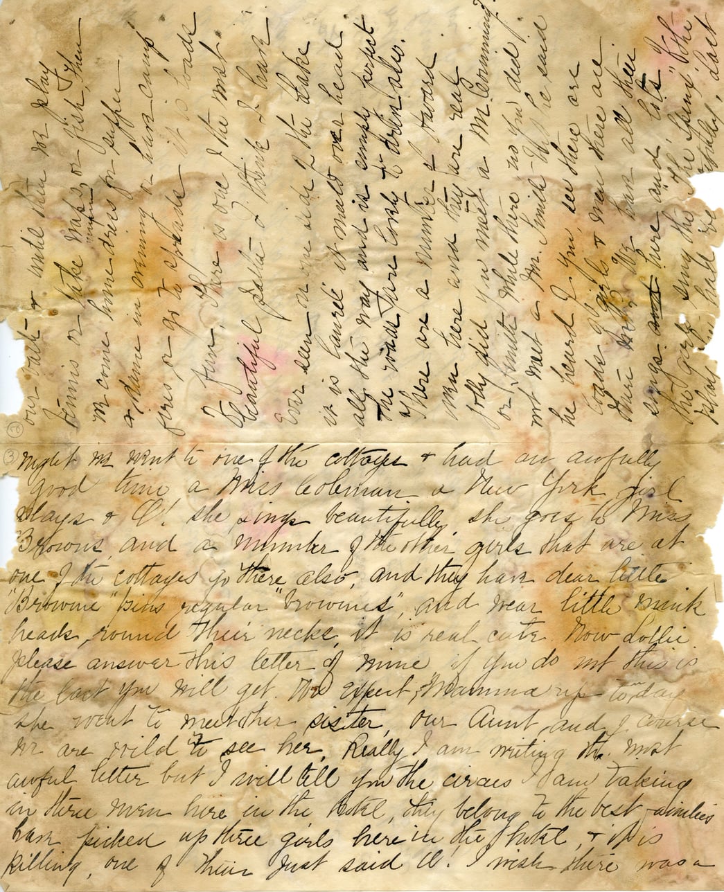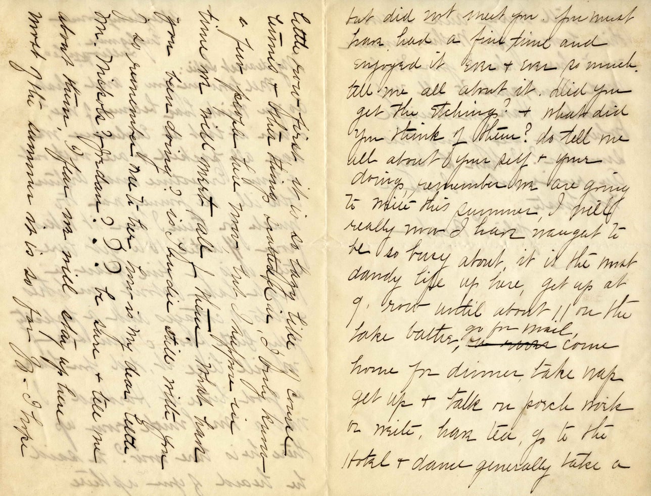 Little Eva—Find it is so easy like I know yours & their things scattered in a busy house— Four people this morn, but I suppose not a time we will meet all here—Much love You been doing? We haven't still will you remember me—the poor is my dear little Mr. Nichols? Jordan? S.S. to write & tell me about them. You we will stay up here most of the summer as is so far. So—I hope but did not meet you. You must have had a fine time and enjoyed it here & me so much. Tell me all about it. Did you get the stocking? & what did you think of them? Do tell me all about yourself & your doing. Remember I'm going to write this summer, I really really now I have naught to be so busy about, it is the most dandy life up here, get up at 9, breakfast until about 11 on the lake bath, go for mail, come home for dinner, take nap, get up & talk on porch work or write, have tea, go to the hotel & dance generally take a