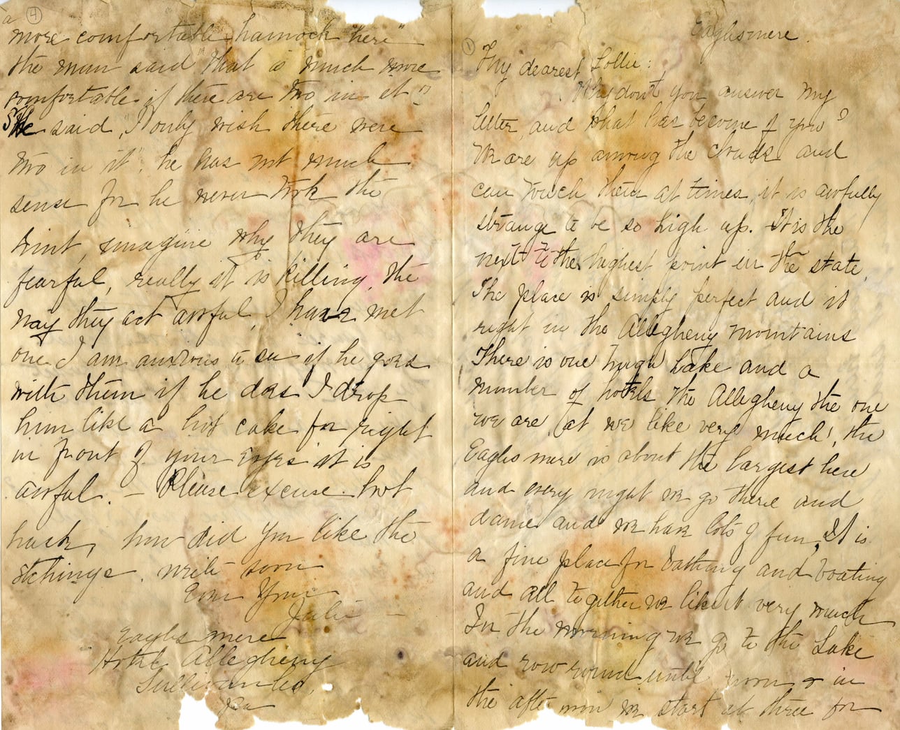 a more comfortable hammock here." The man said "that is much more comfortable if there are two in it." She said, "I only wish there were two in it." He has not much sense for he never took the hint imagine why they are fearful, really it is killing. The way they act fearful, I have met one. I am anxious to see if he goes with them if he does I drop him like a hot cake for night in front of your eyes it is awful. Please excuse but much how did you like the etchings - with some love from Julia Eaglesmere Hotel Allegheny Smithfield Pa My dearest Lolly: Wasn't you answer my letter and what has become of you? We are up among the clouds and can touch them at times, it is awfully strange to be so high up. It is the next to the highest point in the state. The place is simply perfect and is right in the Allegheny mountains. There is one large lake and a number of hotels the Allegheny the one we are let us like very much, the Eaglesmere about the largest here and every night we go there and dance and we have lots of fun. It is a fine place for bathing and boating and all together we liked it very much. In the morning we go to the lake and row around until noon or in the afternoon we start at three for