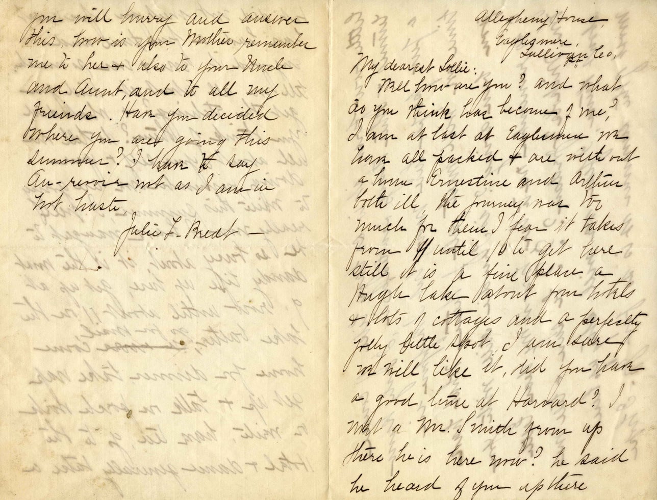 pm will hurry and answer this, now is your Mother remember me to her & also to your Uncle and Aunt, and to all my friends. Have you decided where you are going this summer? I have to say Au-revoir not as I am in hot haste. Julie L. Brett Alleghenytone, Englewood, Sullivan Co. My dearest Lollie: Well how are you? And what do you think has become of me? I am at last at Englewood we have all packed & are without a home. Ernestine and Arthur both ill. The journey was too much for them. I fear it takes from 4 until 10 to get here still it is a fine place, a bright lake, fat out your hotels & plots of cottages and a perfectly jolly little shot. I am sure we will like it. Did you have a good time at Harvard? I met a Mr. Smith from up there he is here now? he said he heard of you up there