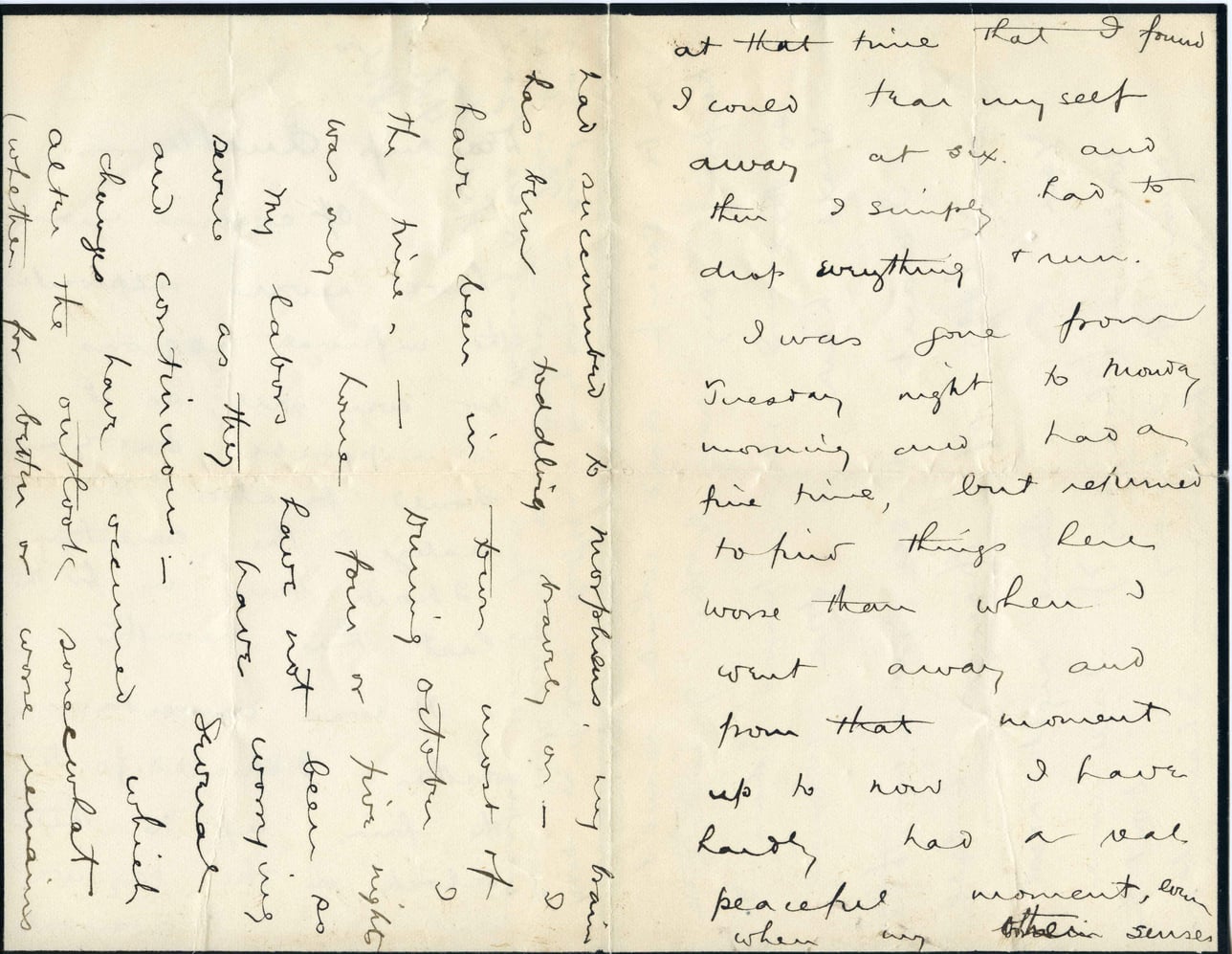had succumbed to morphine, my brain has been troubling heavily and I have been in from most of the time, during October. The thing I know for sure is that it was only because I have not been to my labours have not been worrying about pecuniary as they have been and continuous in charges have occurred which alter the outlook somewhat (whether for better or worse remains at that time that I found I could tear myself away at six and then I simply had to drop everything & run. I was gone from Tuesday night to Monday morning and had a fine time, but returned to find things here worse than when I went away and from that moment up to now I have hardly had a real peaceful moment, even when my other senses