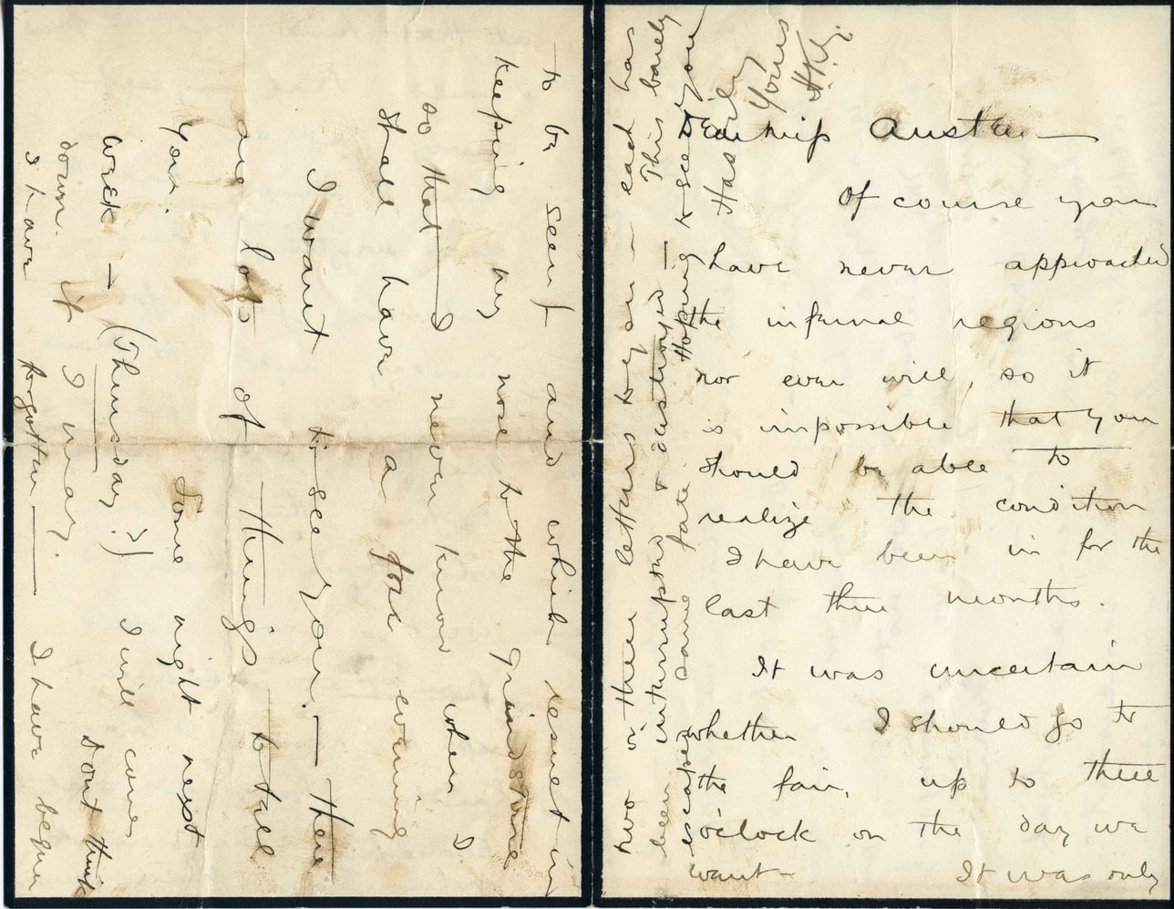 To be seen & and which I heard in keeping my note to the Grindstone so that I never know when I shall have a free evening I want to see you.—Then our lots of things to free your week—(Thursday?) I will come down if I mean, I have begun to gather— Austria— Of course you have never approached the infirm regions nor even will, so it is impossible that you should be able to realize the condition I have been in for the last three months. It was uncertain whether I should go to the fair, up to three o'clock on the day we want—It was only two or three letters kept me each hour from interruptions & distractions by this barely coming past hoping to see you. Yours Helen Mr.