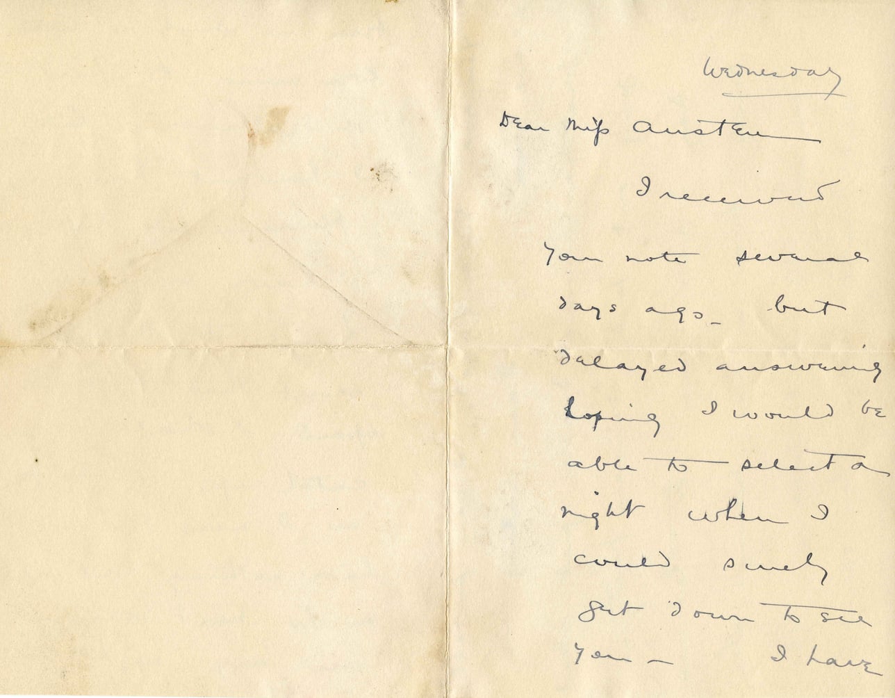 Wednesday Dear Mrs. Austen, I received your note several days ago—but delayed answering hoping I would be able to select a night when I could surely get down to see you—I have