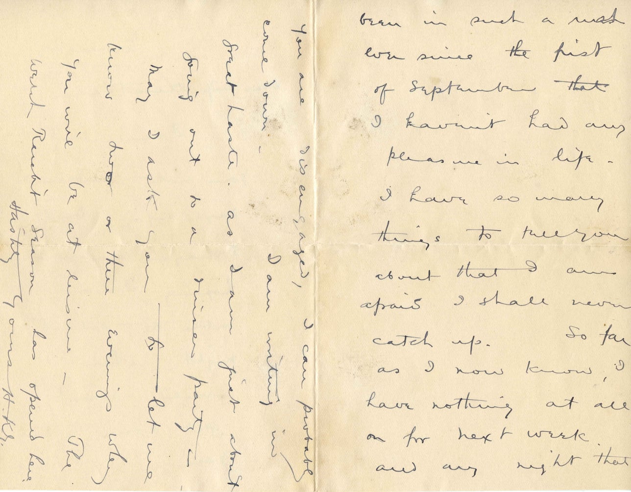 You are so encouraged, I can probably come down. I am writing in great haste as I am just about going out to a winter party and I ask you to let me know when or this evening when you will be at home. The week next season has opened here. I have been in such a mad love since the first of September that I haven't had any pleasure in life. I have so many things to tell you about that I am afraid I shall never catch up. So far as I now know, I have nothing at all on for next week and any night that