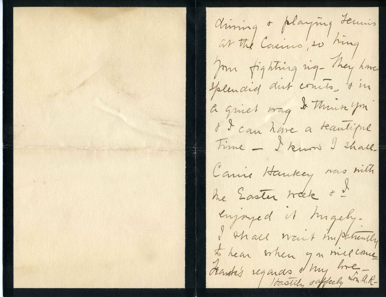 dining & playing Tennis at the Casino, so bring your fighting rig—they have splendid dirt courts, & in a quiet way I think you & I can have a beautiful time—I know I shall. Carrie Hankey was with me Easter week & I enjoyed it hugely. I shall wait impatiently to hear when you will come. Haste's regards & my love— Faithfully, affectionately, for A.R.