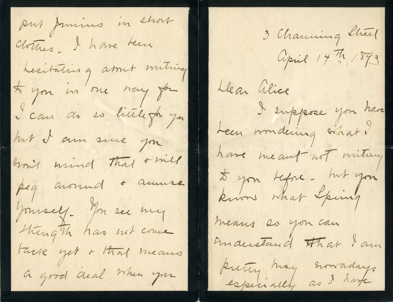 ---Put Januins in short clothes. I have been hesitating about writing to you in one way for I can do so little for you but I am sure you won't mind that & will peg around & amuse yourself. You see my strength has not come back yet & that means a good deal when you 3 Channing Street April 14th, 1893 Dear Alice, I suppose you have been wondering what I have meant—not writing to you before—but you know what Spring means so you can understand that I am pretty busy nowadays especially as I have