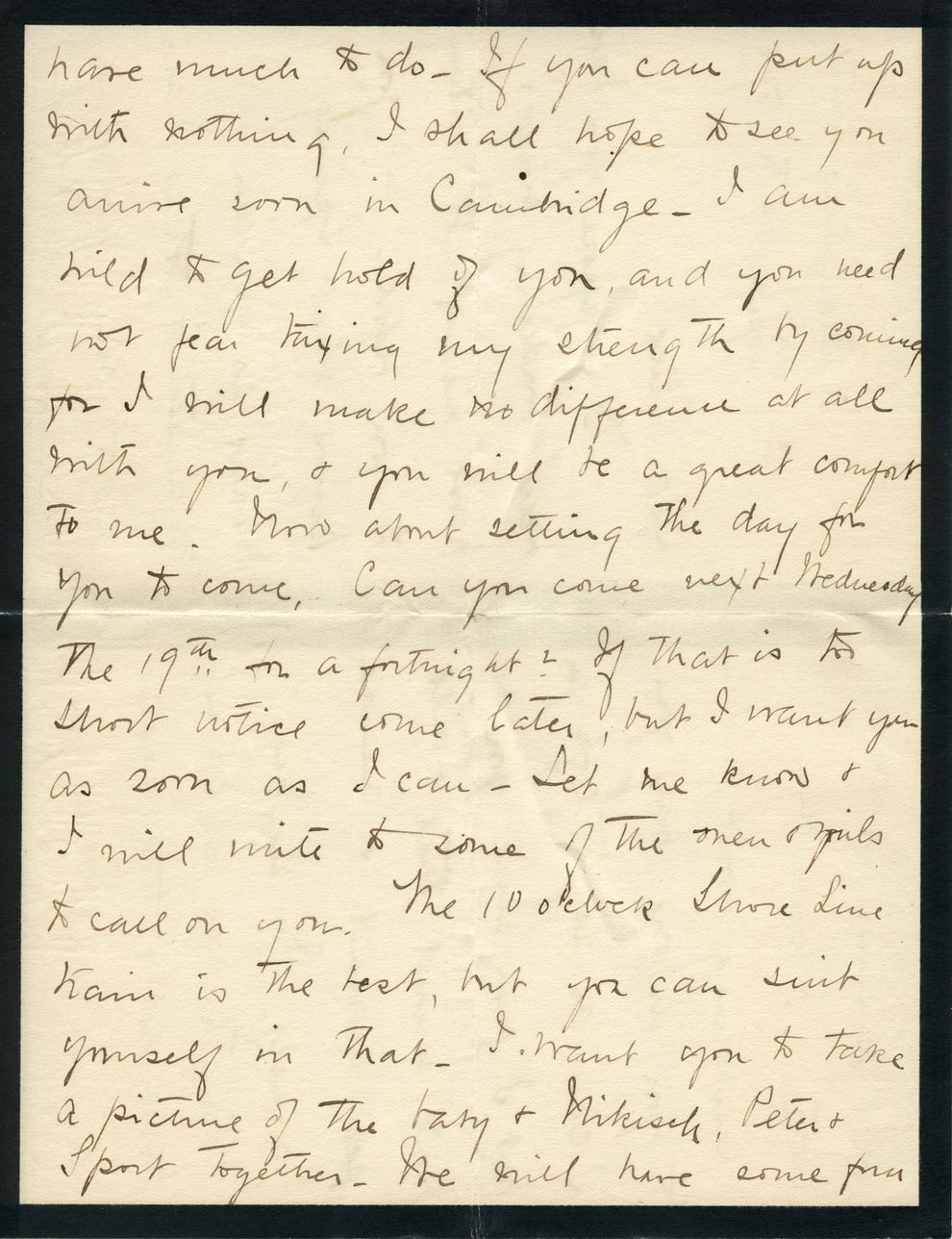 have much to do—if you can put up with nothing, I shall hope to see you arrive soon in Cambridge. I am wild to get hold of you, and you need not fear trying my strength by coming for I will make no difference at all with you, & you will be a great comfort to me. How about setting the day for you to come? Can you come next Wednesday the 19th or a fortnight? If that is too short notice come later, but I want you as soon as I can—Let me know & I will write to some of the other girls & call on you. The 10 o'clock Shore Line train is the best, but you can suit yourself in that—I want you to take a picture of the Gary & Nikisch, Peter & Sport together. We will have some fun