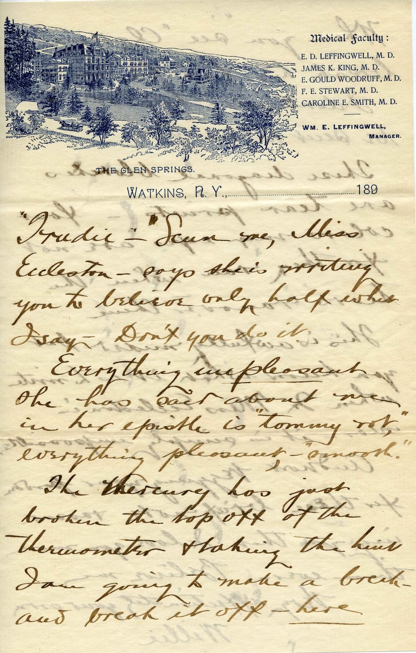 Medical Faculty: E. D. LEFFINGWELL, M. D. JAMES K. KING, M. D. E. GOULD WOODRUFF, M. D. F. E. STEWART, M. D. CAROLINE E. SMITH, M. D. WM. E. LEFFINGWELL, MANAGER. THE GLEN SPRINGS. WATKINS, R. Y., 189 "Prudie—Scam you, Miss Eccleston—says she is writing you to believe only half what I say—Don't you do it. Everything unpleasant she has said about me in her epistle is "tommy rot," everything pleasant—"smooth." The thermory has just broken the top off of the thermometer & taking the hint I am going to make a break and break it off—here