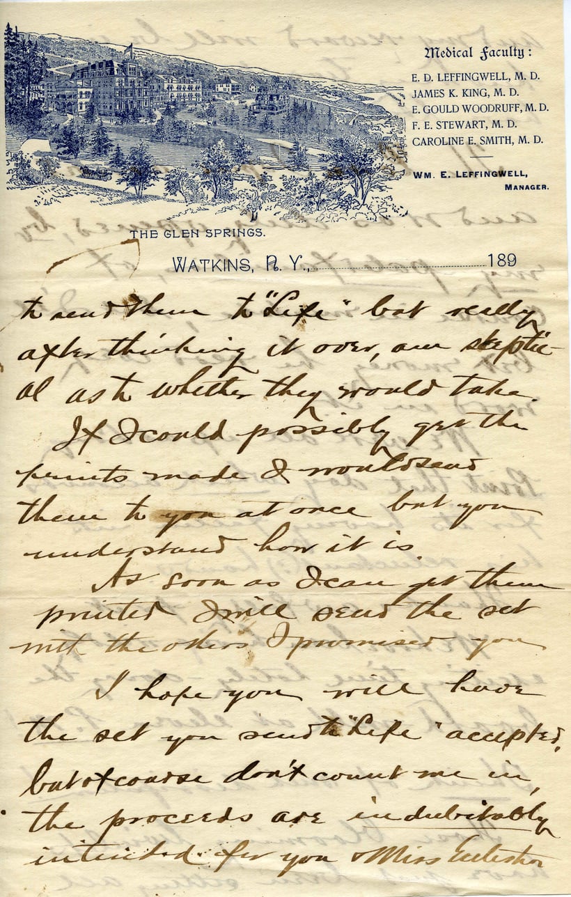 Medical Faculty: E. D. LEFFINGWELL, M.D. JAMES K. KING, M.D. E. GOULD WOODRUFF, M.D. F. E. STEWART, M.D. CAROLINE E. SMITH, M.D. WM. E. LEFFINGWELL, MANAGER. THE GLEN SPRINGS. WATKINS, N.Y., 189 to hear them to "Life" but ready after thinking it over, am skeptical as to where they would take. If I could possibly get the points made & would send them to you at once but you understand how it is. As soon as I can get them printed I will send the set with the others I promised you. I hope you will have the set you sent to "Life" accepted, but of course don't count me in, the proceeds are indefinitely intended for you & Miss Gulick.