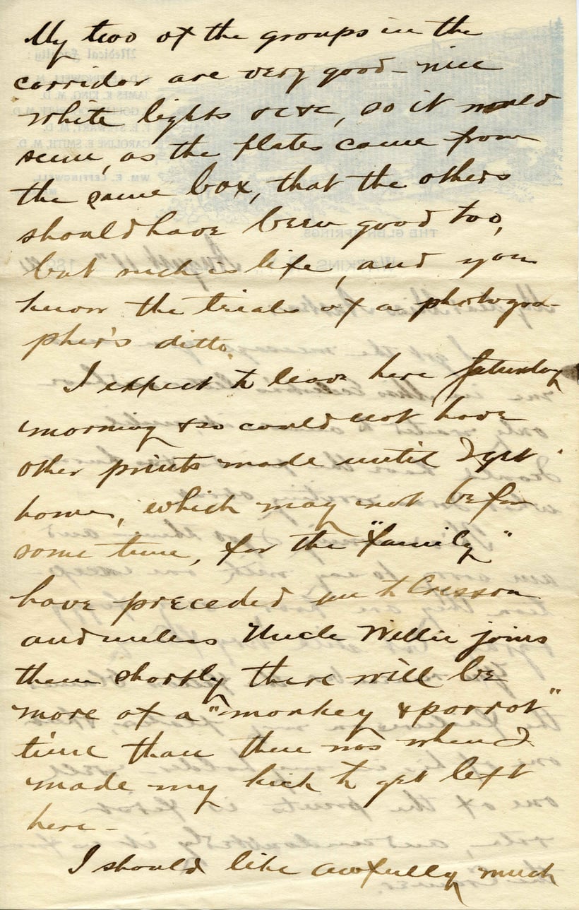 My two of the groups in the corridor are very good—nice white lights over, so it would seem as the plates came from the same box, that the others should have been good too, but such is life, and you know the trials of a photographer's ditto. I expect to leave here Saturday morning & so could not have other prints made until next hour, which may not be for some time, for the "family" have preceded me to Cresson and unless Uncle Willie joins them shortly there will be more of a "monkey & porrot" time than there was when I made my kick to get left here— I should like awfully much