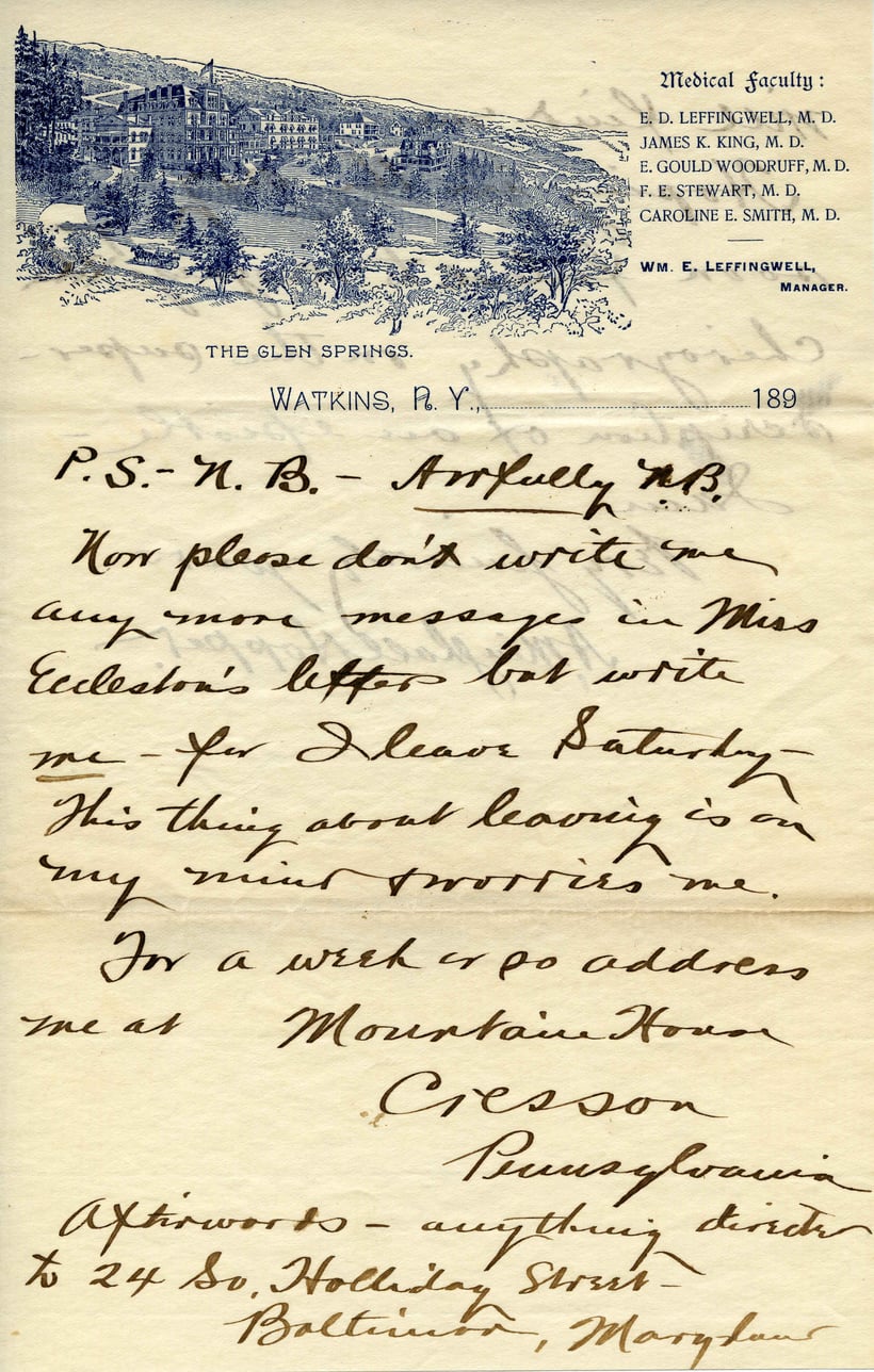 Medical Faculty: E. D. LEFFINGWELL, M. D. JAMES K. KING, M. D. E. GOULD WOODRUFF, M. D. F. E. STEWART, M. D. CAROLINE E. SMITH, M. D. WM. E. LEFFINGWELL, MANAGER. THE GLEN SPRINGS. WATKINS, R. Y., 189 P.S.- N.B. - Normally N.B. Now please don't write me any more message in Miss Eccleston's letter but write me—for I leave Saturday—This thing about leaving is on my mind & worries me. For a week or so address me at Mountain House Cresson Pennsylvania Afterwards—anything directed to 24 So. Holliday Street— Baltimore, Maryland