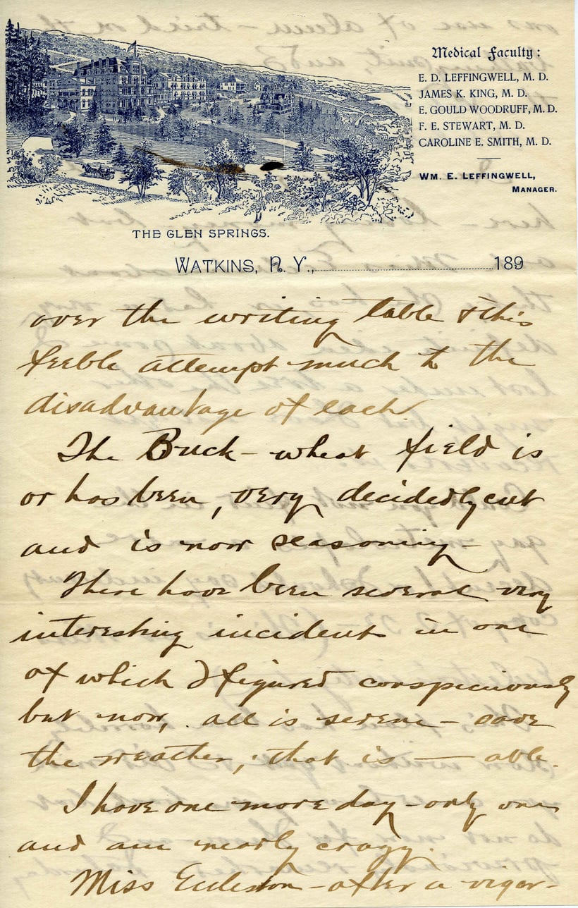 Medical Faculty: E. D. LEFFINGWELL, M.D. JAMES K. KING, M.D. E. GOULD WOODRUFF, M.D. F. E. STEWART, M.D. CAROLINE E. SMITH, M.D. WM. E. LEFFINGWELL, MANAGER. THE GLEN SPRINGS. WATKINS, N.Y., 189 over the writing table & his feeble attempt much to the disadvantage of each. The Buck-wheat field is or has been, very decidedly cut and is now seasoning—there have been several very interesting incidents in one of which I figured conspicuously but now, all is serene—over the weather, that is—able. I have one more day—only one—and am nearly crazy. Miss Eudelton—after a vigor-