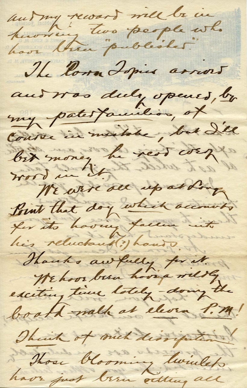 and my reward will be in knowing two people who have been "published." The Down Topics arrived and was duly opened, by my pates familiar, of course in mistake, but I'll bet money he read every word in it. We were all up at Long Point that day which accounts for its having fallen into his reluctant hands. Thanks awfully for it. We have been having wildly exciting time lately—doing the boardwalk at eleven P.M! Think of such dissipation! Those blooming twinlets have just been setting all