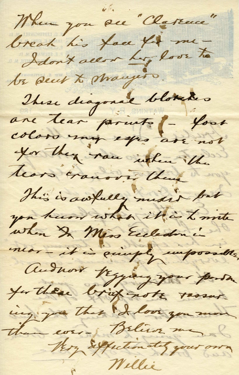 When you see "Clarence" break his face for me— I don't allow her love to be sent to strangers. These diagonal blots are tear prints—foot colors my eyes are not for they ran when the tears ran over them. This is awfully messed but you know what it is to write when Dr. Miss Echelon is near—it is simply impossible. And now begging your pardon for these brief note assuring you that I love you more than ever—Believe me Very affectionately your own Willie