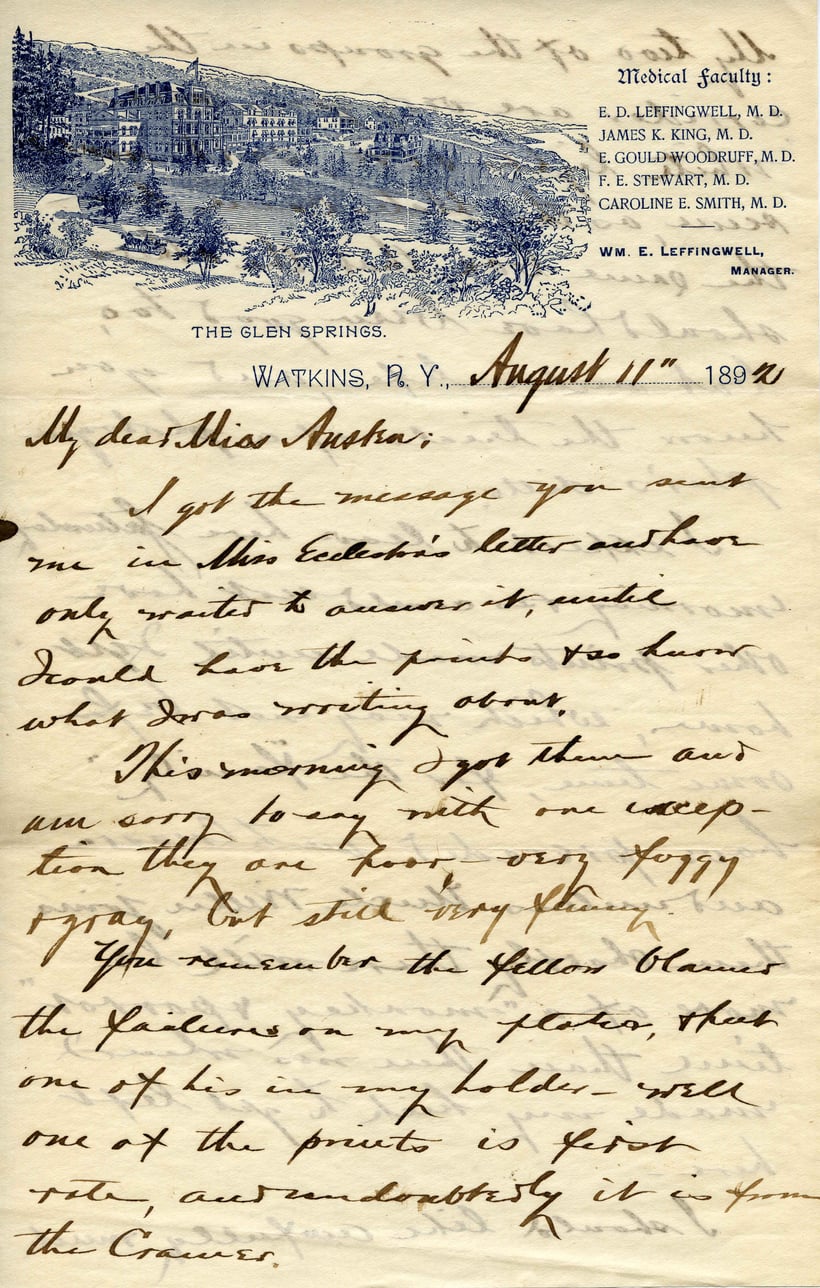 @alice_austen -> participated in -> @worlds_columbian_exposition_1893 {role: "photographer"}Medical Faculty: E. D. LEFFINGWELL, M.D. JAMES K. KING, M.D. E. GOULD WOODRUFF, M.D. F. E. STEWART, M.D. CAROLINE E. SMITH, M.D. WM. E. LEFFINGWELL, MANAGER. THE GLEN SPRINGS. WATKINS, R.Y., August 11th, 1892 My dear Miss Austen: I got the message you sent me in Miss Eccleston's letter and have only waited to answer it, until I could hear the prints & so know what I was writing about. This morning I got them and am sorry to say with one exception they are poor—very foggy spray, but still very fine. You remember the fellow blames the failures on my plates, that one of his in my holder—well one of the prints is first rate, and undoubtedly it is from the Crawes.