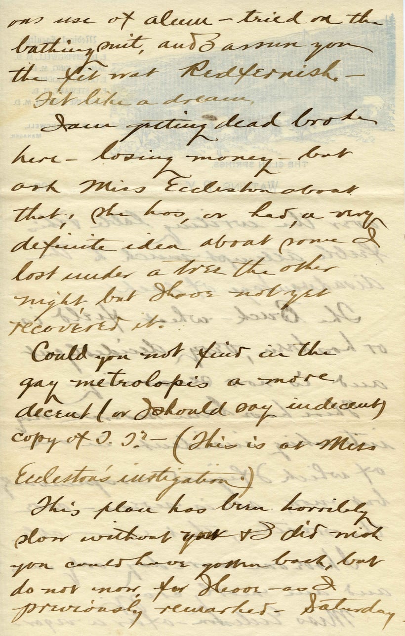 was use of alarm—tried on the bathing suit, and I assure you the fit was Redfernish.—Fit like a dream. I am getting dead broke here—losing money—but took Miss Eccleston about that, she has, or had, a very definite idea about some I lost under a tree the other night but does not yet recovered it. Could you not find in the gay metropolis a more decent (or should say indecent) copy of J.J.?—(This is at Miss Eccleston's instigation.) This plan has been horribly slow without you & I did wish you could have gotten back, but do not now for Heoos—as I previously remarked—Saturday