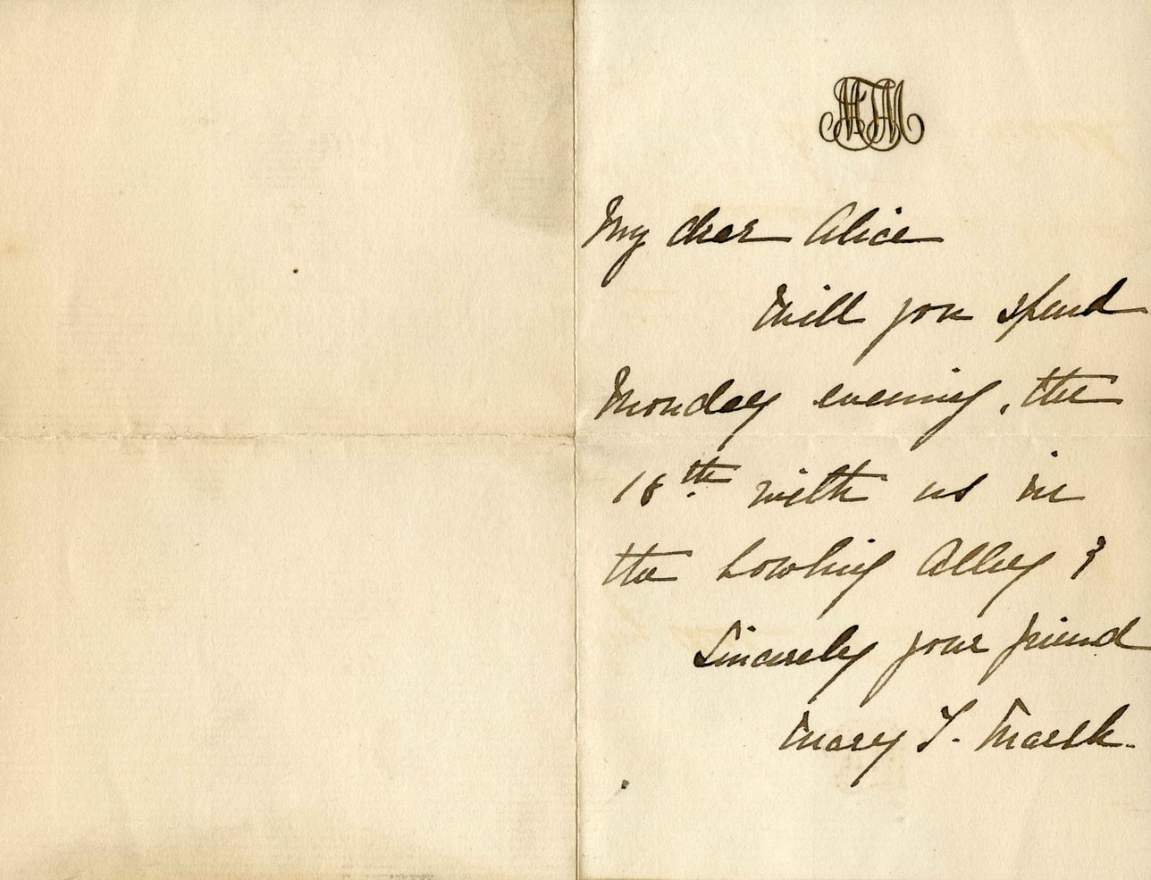 My dear Alice, Will you spend Monday evening, the 16th with us in the Bowling Alley? Sincerely your friend, Mary T. Welch.