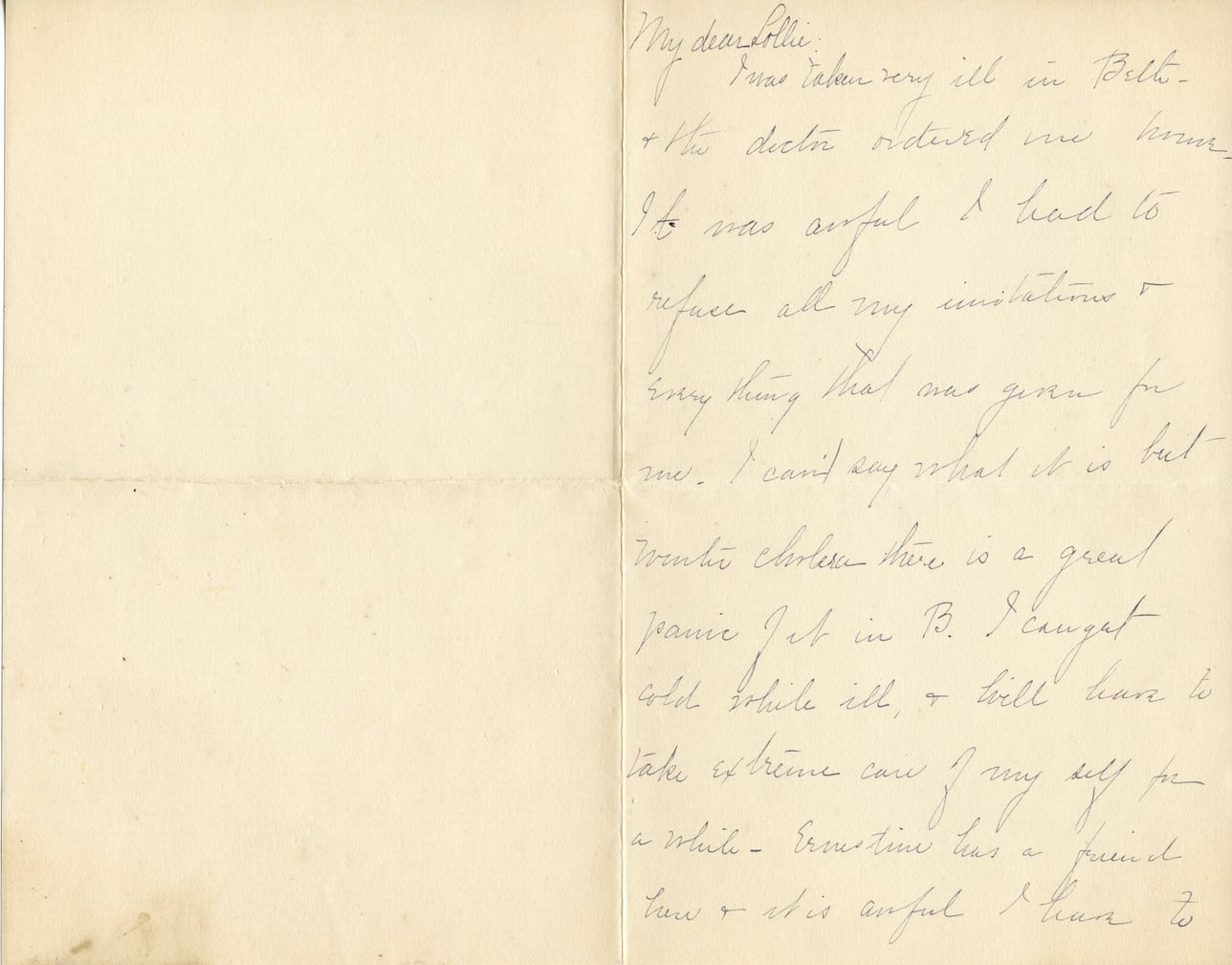My dear Lollie: I was taken very ill in Beth- & the doctor ordered me home. It was awful I had to refuse all my invitations & everything that was given for me. I can't say what it is but winter cholera there is a great panic just in B. I caught cold while ill, & will have to take extreme care of myself for a while. Ernestine has a friend here & it is awful I hear to