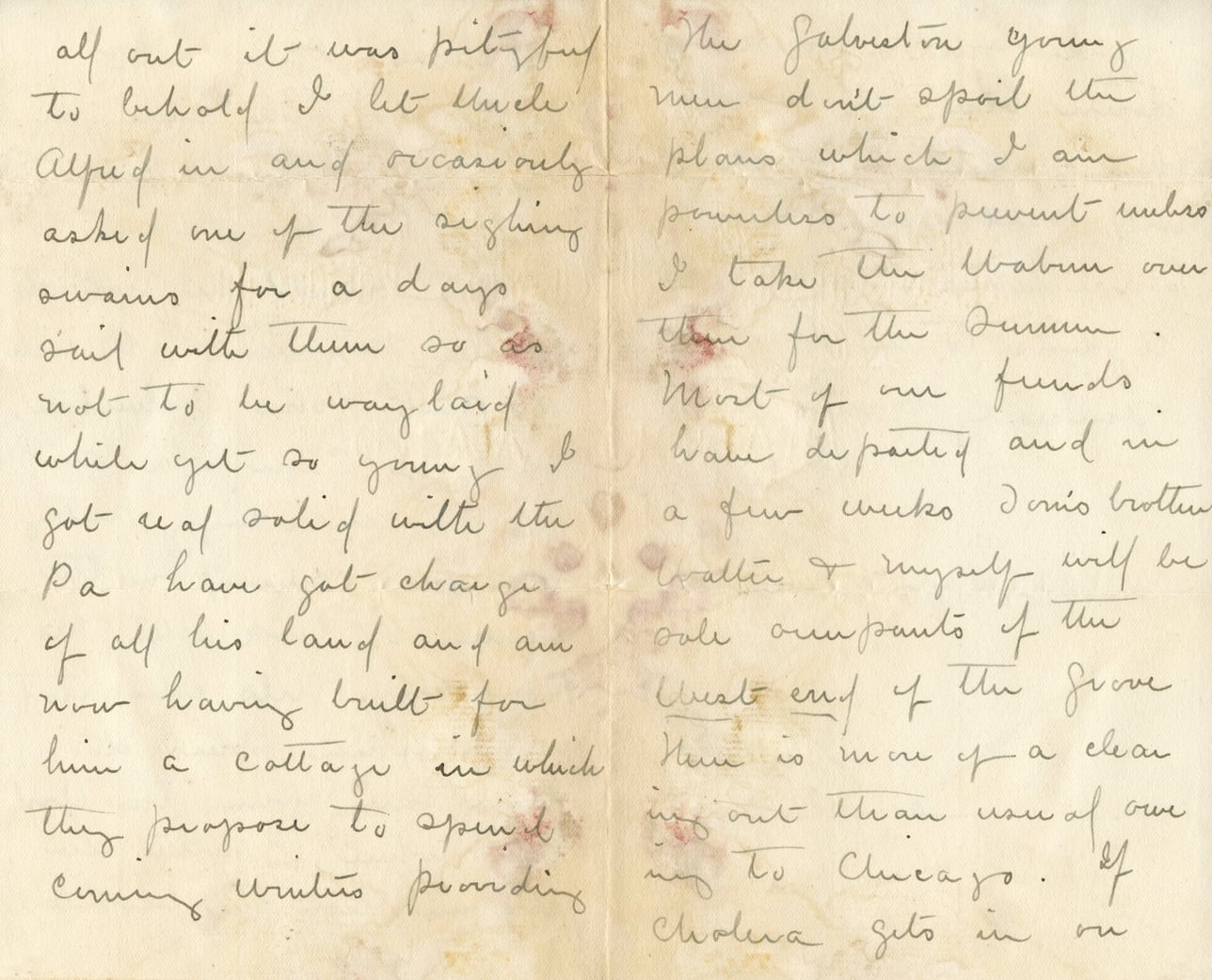 all out it was pitiful to behold. I let uncle Alfred in and occasionally asked me if the sighing owains for a day's visit with them so as not to be waylaid while yet so young. I got so afraid with the Pa have got charge of all his land and am now having built for him a cottage in which they propose to spend coming winters providing The Salveston young men don't spoil the plans which I am powerless to prevent unless I take the Wabun over there for the summer. Most of our friends have departed and in a few weeks Denis brother Walter & myself will be sole occupants of the west end of the Grove. There is more of a cleaning out than usual owing to Cholera. If Cholera gets in on