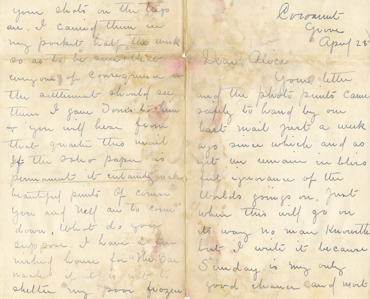 your shots on the trip are, I carried them in my pocket half the week so as to be sure that every one of our young men in the settlement should see them. I gave Jones to him & you will hear from that quarter this mail. If the Soho paper is permanent it certainly makes beautiful prints. Of course you and Nell are to come down. What do you suppose I have a fine new house for "The Bar nach" if it is not to shelter my poor frozen Coronavut June April 23 Dear Alice, Your letter and the photo prints came safely to hand by our last mail just a week ago since which and as yet we remain in blissful ignorance of the world's goings on. Just when this will go on its way no man knows but I write it because Sunday is my only good chance and most