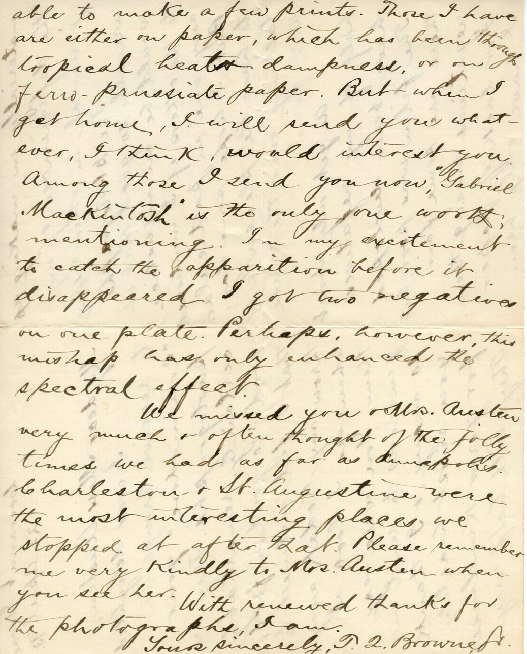 able to make a few prints. Those I have are either on paper, which has been through tropical heat & dampness, or on ferro-prussiate paper. But when I get home, I will send you whatever, I think, would interest you. Among those I send you now, "Gabriel Mackintosh" is the only one worth mentioning. In my excitement to catch the apparition before it disappeared I got two negatives on one plate. Perhaps, however, this mishap has only enhanced the spectral effect. We missed you & Mrs. Austen very much & often thought of the jolly times we had as far as Annapolis. Charleston & St. Augustine were the most interesting places we stopped at after that. Please remember me very kindly to Mrs. Austen when you see her. With renewed thanks for the photographs, I am, Yours sincerely, T.L. Browne