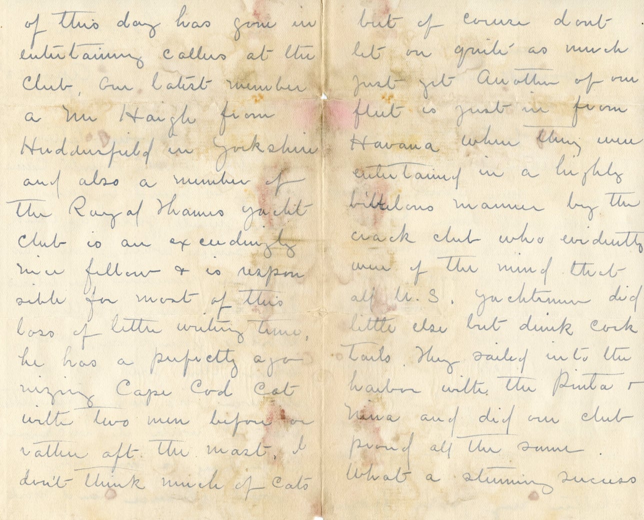 of this day has gone in entertaining callers at the Club. Our latest member, a Mr Haugh from Huddersfield in Yorkshire and also a member of the Royal Thames Yacht Club is an exceedingly nice fellow & is responsible for most of this loss of little writing time. He has a puppety a joy riding Cape Cod Cat with two men before or rather aft the mast. I don't think much of Cats but of course don't let on quite as much just yet. Another of our fleet is just in from Havana when they were entertaining in a highly bittleness manner by the crack club who evidently were of the mind that all U.S. yachtsmen did little else but drink cocktails. They sailed into the harbor with the Pinta Nina and did our club proud all the same. What a stunning success