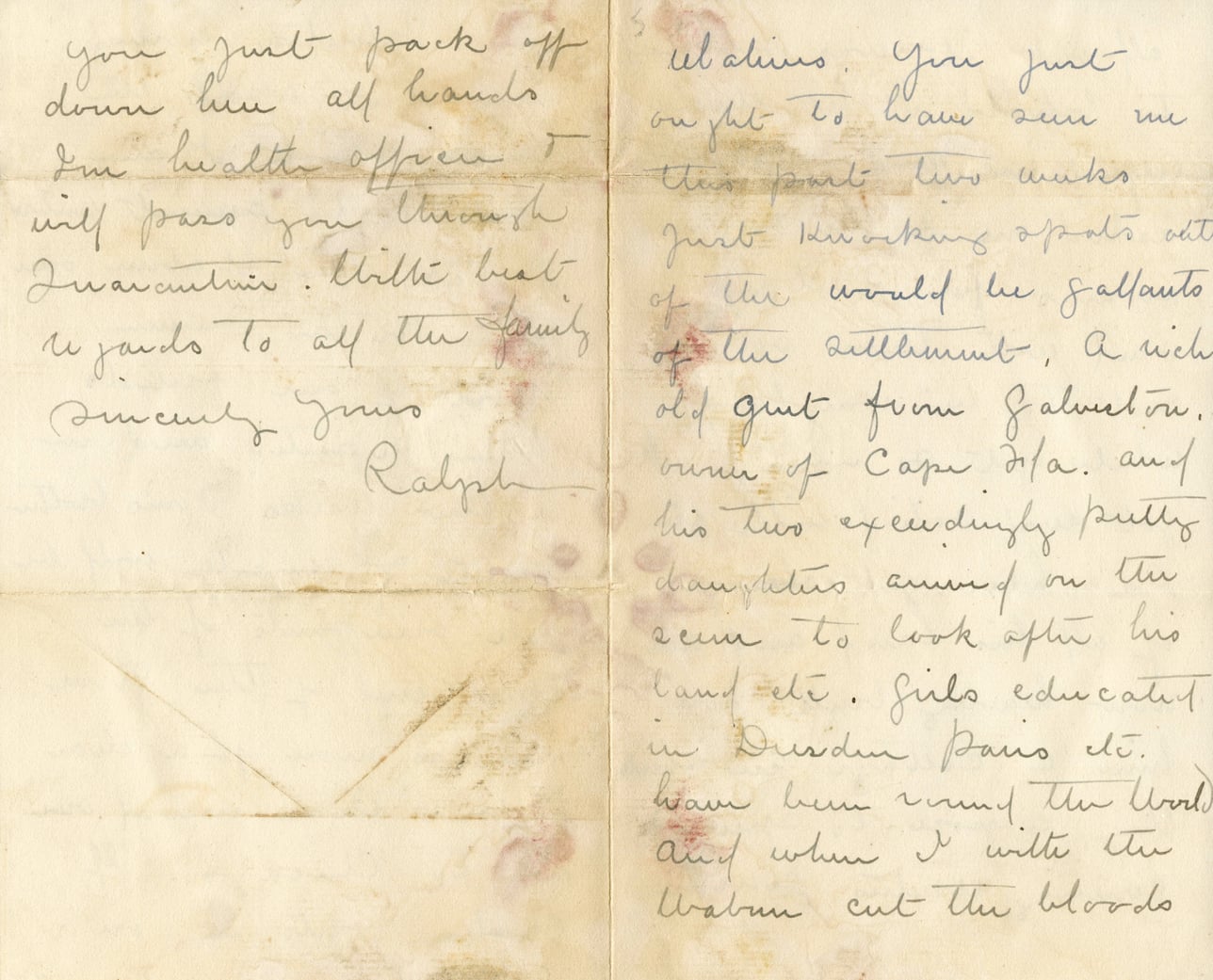 you just pack off down here all hands. I'm health officer & will pass you through quarantine. Little best regards to all the family. Sincerely yours, Ralph Well ahora, you just ought to have seen me this past two weeks. Just knocking spots out of the would be gallants of the settlement. A rich old gent from Galveston, owner of Cape H/a. and his two exceedingly pretty daughters arrived on the scene to look after his land etc. Girls educated in Dresden Paris etc. have been round the world and when I with the wabun cut the bloods