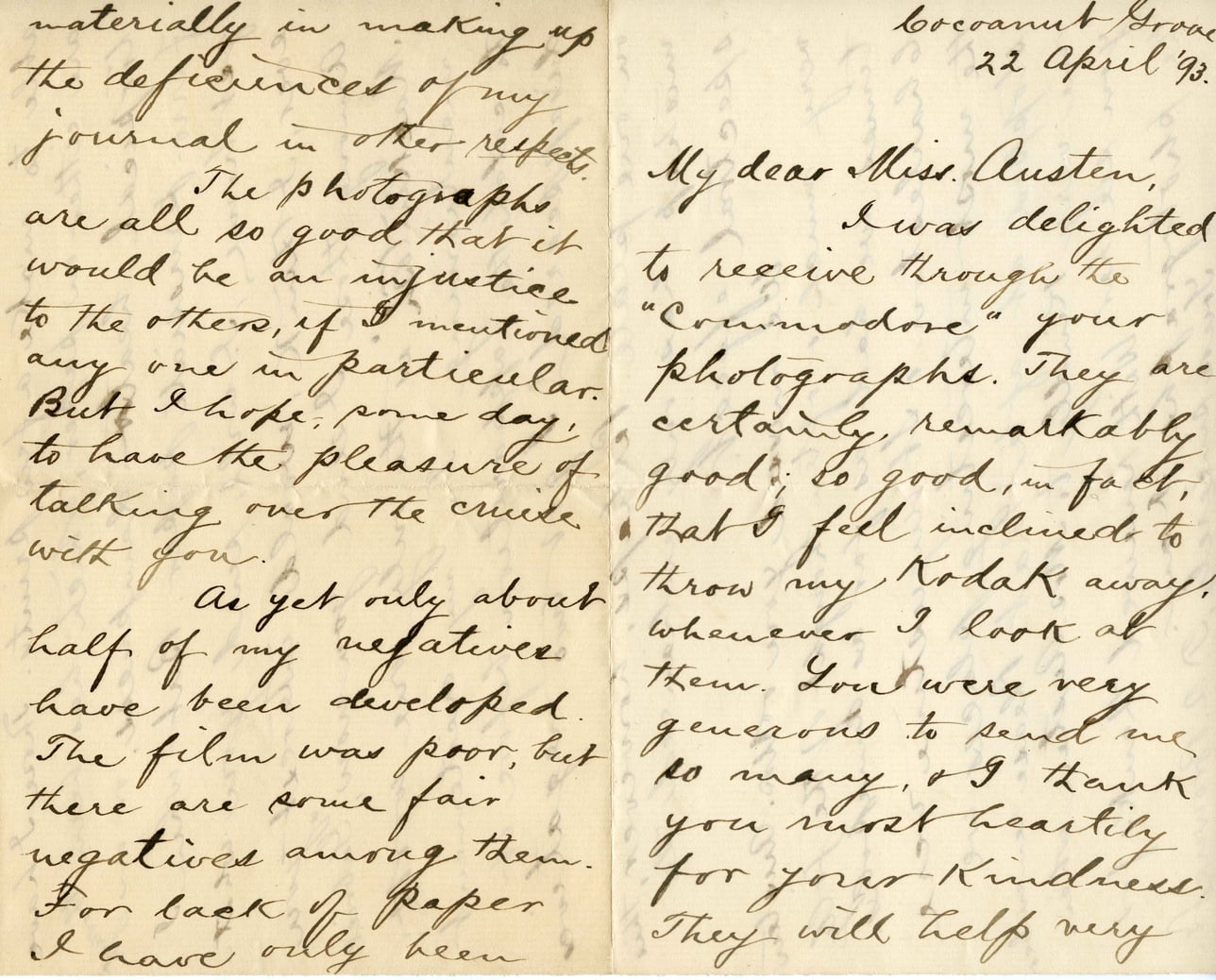 @letter_ralph_munroe_april_23_1893:document -> mentions -> @rose_bank:placematerially in making up the deficiencies of my journal in other respects. The photographs are all so good that it would be an injustice to the others, if I mentioned any one in particular. But I hope, some day, to have the pleasure of talking over the cruise with you. As yet only about half of my negatives have been developed. The film was poor, but there are some fair negatives among them. For lack of paper I have only been Coconut Grove 22 April '93. My dear Miss Austen, I was delighted to receive through the "Commodore" your photographs. They are certainly remarkably good; so good, in fact, that I feel inclined to throw my Kodak away, whenever I look at them. You were very generous to send me so many, & I thank you most heartily for your kindness. They will help very