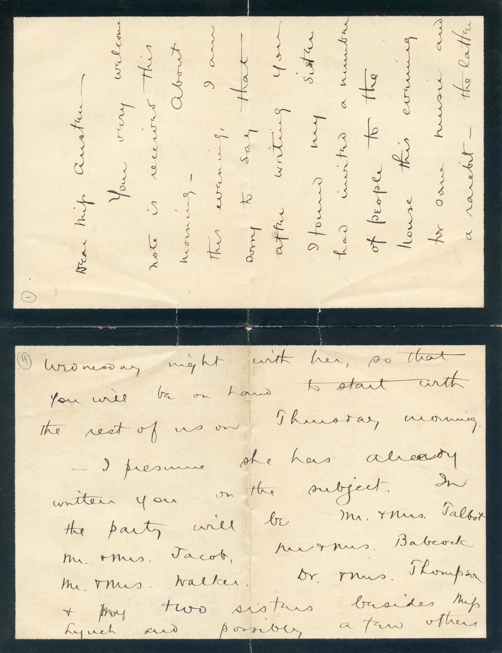 @letter_004 -> mentions -> @play_evening_reception:eventDear Miss Austin, Your very welcome note is received this morning—About this evening, I am sorry to say that after writing you I found my sister had invited a number of people to the house this evening for some music and a rantlet—the latter Wednesday night with her, so that you will be on hand to start with the rest of us on Thursday morning. I presume she has already written you on the subject. In the party will be Mr. & Mrs. Talbot, Mr. & Mrs. Jacob, Mr. & Mrs. Walker, Dr. & Mrs. Thompson & poor two sisters besides Miss Lynch and possibly a few others