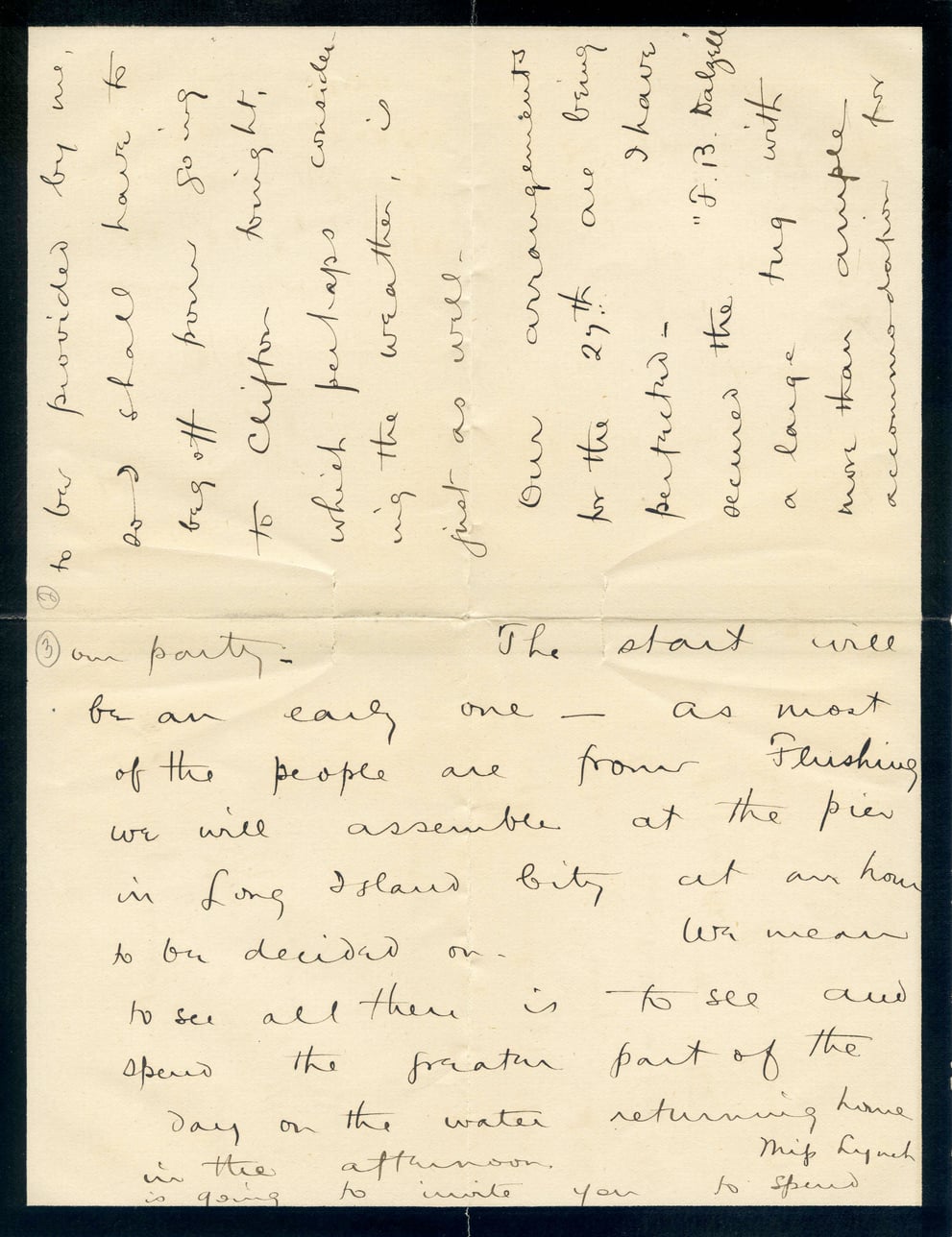 to be provided by me, as I shall have to beg off from going to Cliffon tonight, which perhaps considering the weather, is just as well. Our arrangements for the 27th are being perfected— "The start will be an early one—as most of the people are from Flushing we will assemble at the pier in Long Island City at an hour to be decided on. We mean to see all there is to see and spend the greater part of the day on the water returning home in the afternoon. Miss Lynch is going to invite you to spend