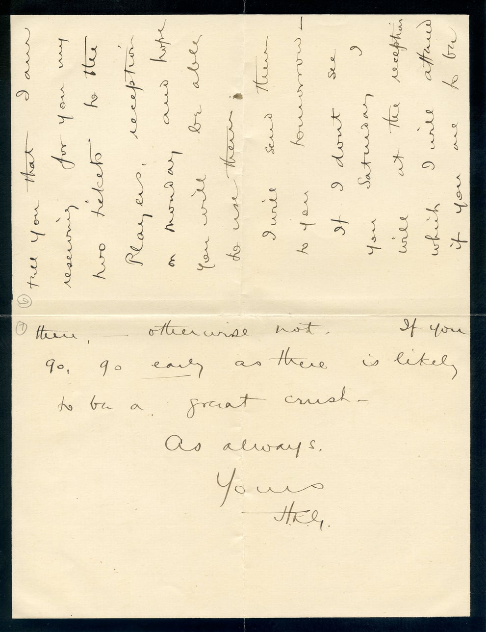 I feel you that I am reserving for you my two tickets to the Play evening reception on Monday and hope you will be able to use them. I will send them to you tomorrow— If I don't see you Saturday, go early as there is likely to be a great crush. As always, Yours HKL
