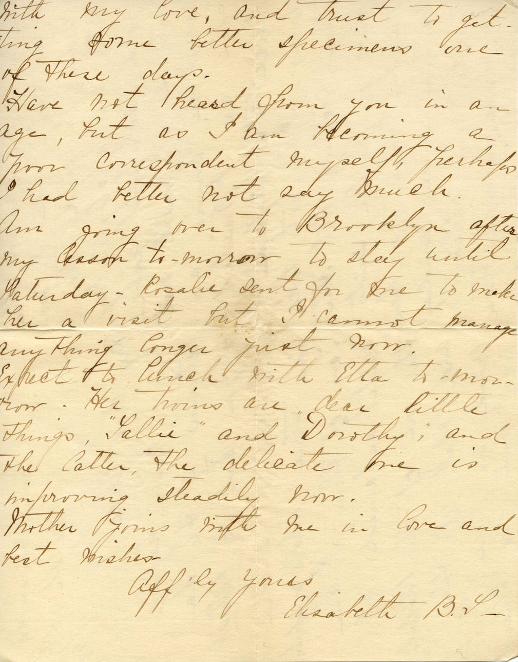 With my love, and trust to get some better specimens soon of these days. Have not heard from you in an age, but as I am becoming a poor correspondent myself, perhaps I had better not say much. Am going over to Brooklyn after my lesson to-morrow to stay until Saturday. Rosalie sent for me to make her a visit but I cannot manage anything longer just now. Expect to lunch with Ella to-morrow. Her twins are dear little things, "Vallie" and Dorothy; and the latter, the delicate one is improving steadily now. Mother joins with me in love and best wishes Aff'ly yours, Elizabeth B.L.
