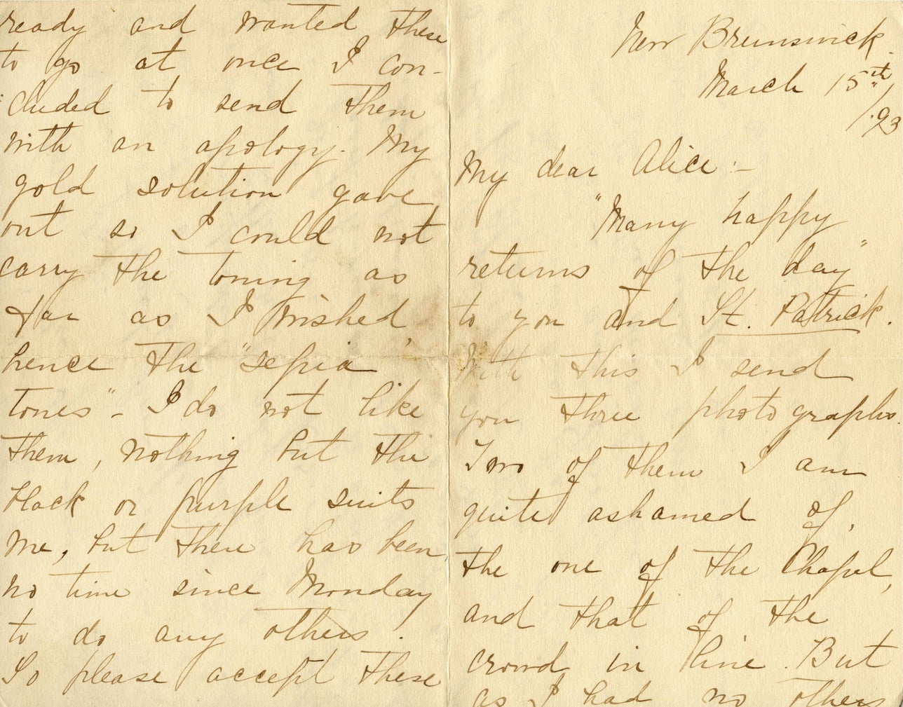 ready and wanted thee to go at once & concluded to send them with an apology. My gold solution gave out so I could not carry the thing as far as I wished, hence the "sepia tones." I do not like them, nothing but the black or purple suits me, but there has been no time since Monday to do any others. So please accept these. New Brunswick March 15th 1893 My dear Alice - "Many happy returns of the day" to you and St. Patrick. With this I send you three photographers. Two of them I am quite ashamed of, the one of the Chapel, and that of the crowd in mine. But as I had no others