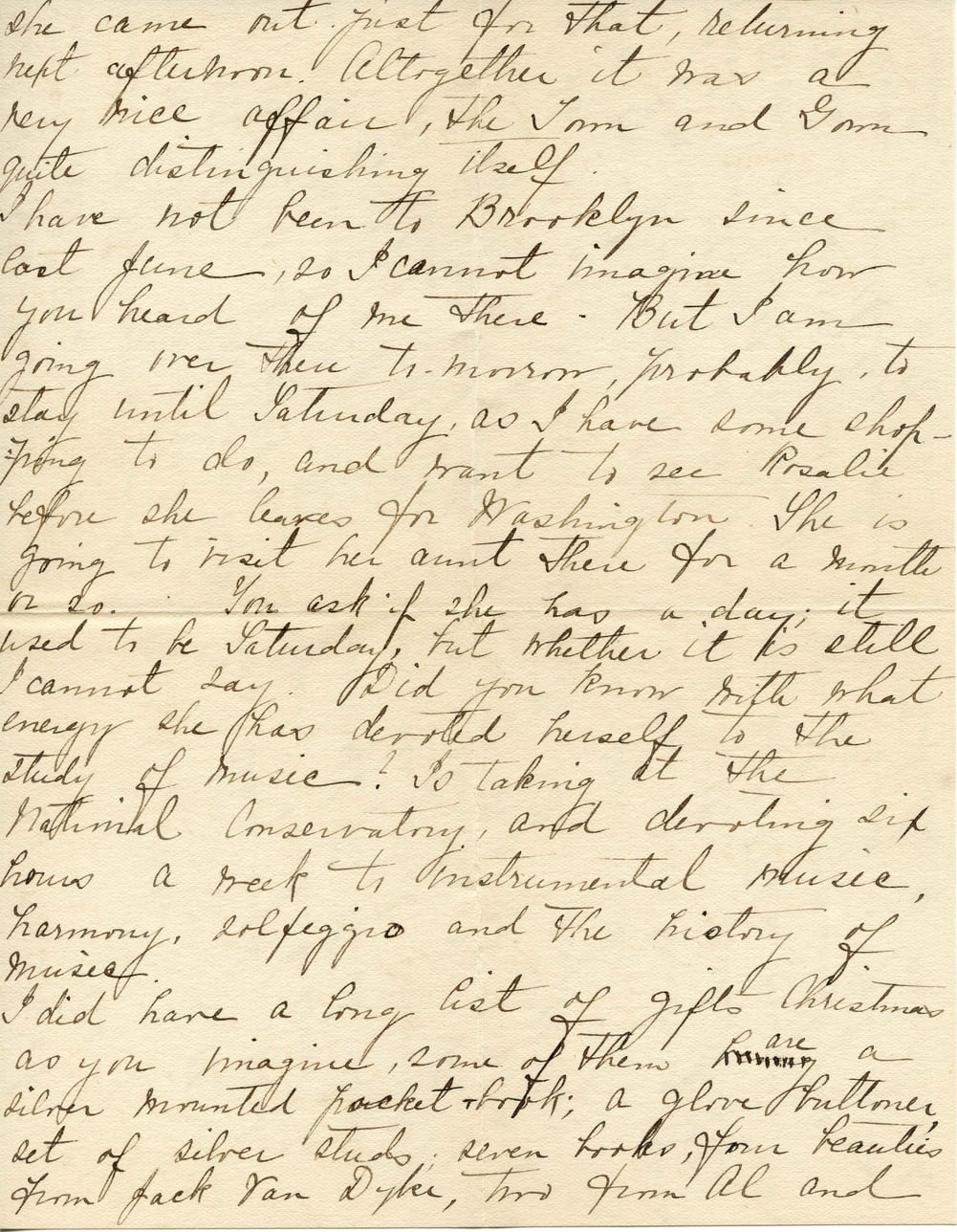 she came out just for that, returning next afternoon. Altogether it was a very nice affair, the Tom and Tom quite distinguishing itself. I have not been to Brooklyn since last June, so I cannot imagine how you heard of me there. But I am going over there tomorrow, probably, to stay until Saturday, as I have some shopping to do, and I want to see Rosalie before she leaves for Washington. She is going to visit her aunt there for a month or so. You ask if she has a day; it used to be Saturday, but whether it is still I cannot say. Did you know with what energy she has devoted herself to the study of music? It's taking it at the National Conservatory, and devoting six hours a week to instrumental music, harmony, solfeggio and the history of music. I did have a long list of gifts Christmas as you imagine, some of them are a silver mounted pocket-book; a glove buttoner set of silver studs; seven books, from Rosalie's from Jack Van Dyke, two from Al and