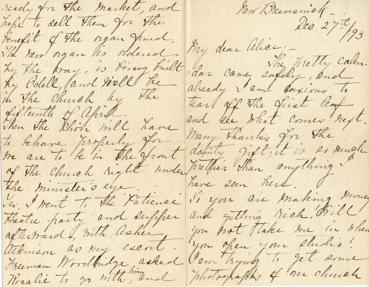 @photography:concept {description: "Elizabeth's photographic business, including sales of images from the 1893 World's Columbian Exposition"}ready for the market, and hope to sell them for the benefit of the organ fund. The new organ is ordered by the way, is being built by Colell, and will be in the church by the fifteenth of April. Then the Rhin will have to behave properly for we are to be in the front of the church right under the minister's eye. Yes, I went to the "Patience" Theatre party and supper afterward, with Asher Atkinson as my escort. Freeman Woolbridge asked Rosalie to go with him, and New Brunswick Dec. 27th '93 My dear Alice:- The pretty calendar came safely, and already I am anxious to tear off the first leaf and see what comes next. Many thanks for the dainty gift; it is so much prettier than anything I have seen hers. So you are making money and getting rich. Will you not take me in when you open your studio? I am trying to get some photographs of our church