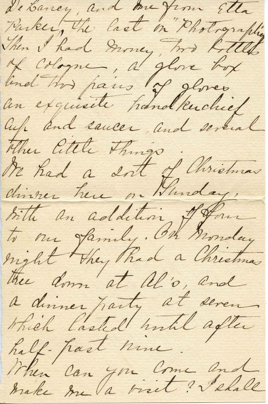 De Laney, and one from Ella Parker, the last on "Photography." Then I had money, two bottles of cologne, a glove box, and two pairs of gloves, an exquisite handkerchief, cup and saucer, and several other little things. We had a sort of Christmas dinner here on Sunday, with an addition of four to our family. On Monday night they had a Christmas tree down at Al's, and a dinner party at seven which lasted until after half-past nine. When can you come and make me a visit? I shall