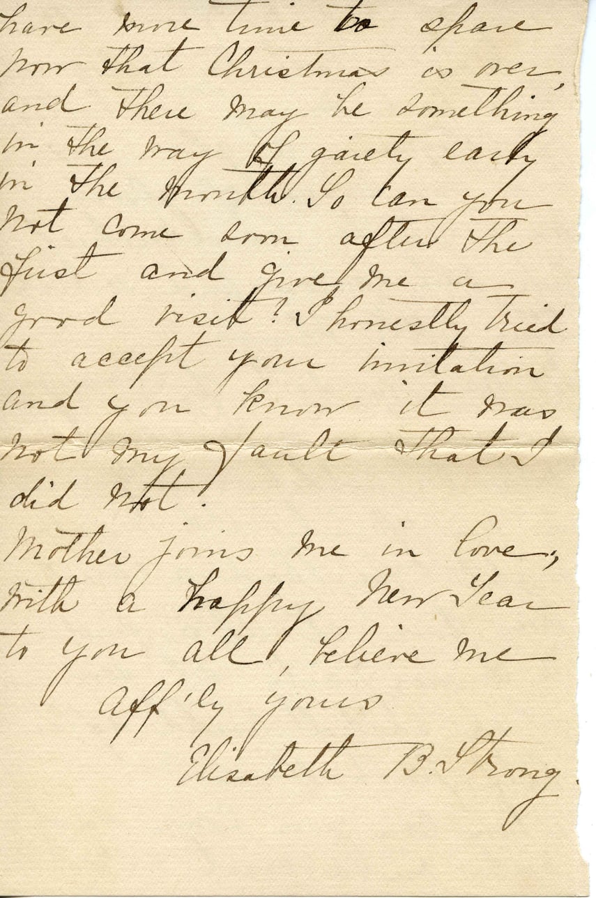 have more time to spare now that Christmas is over, and there may be something in the way of gaiety early in the month. So can you not come down after the first and give me a good visit? I honestly tried to accept your invitation and you know it was not my fault that I did not. Mother joins me in loving with a happy New Year to you all, believe me aff'ly yours, Elizabeth B. Strong