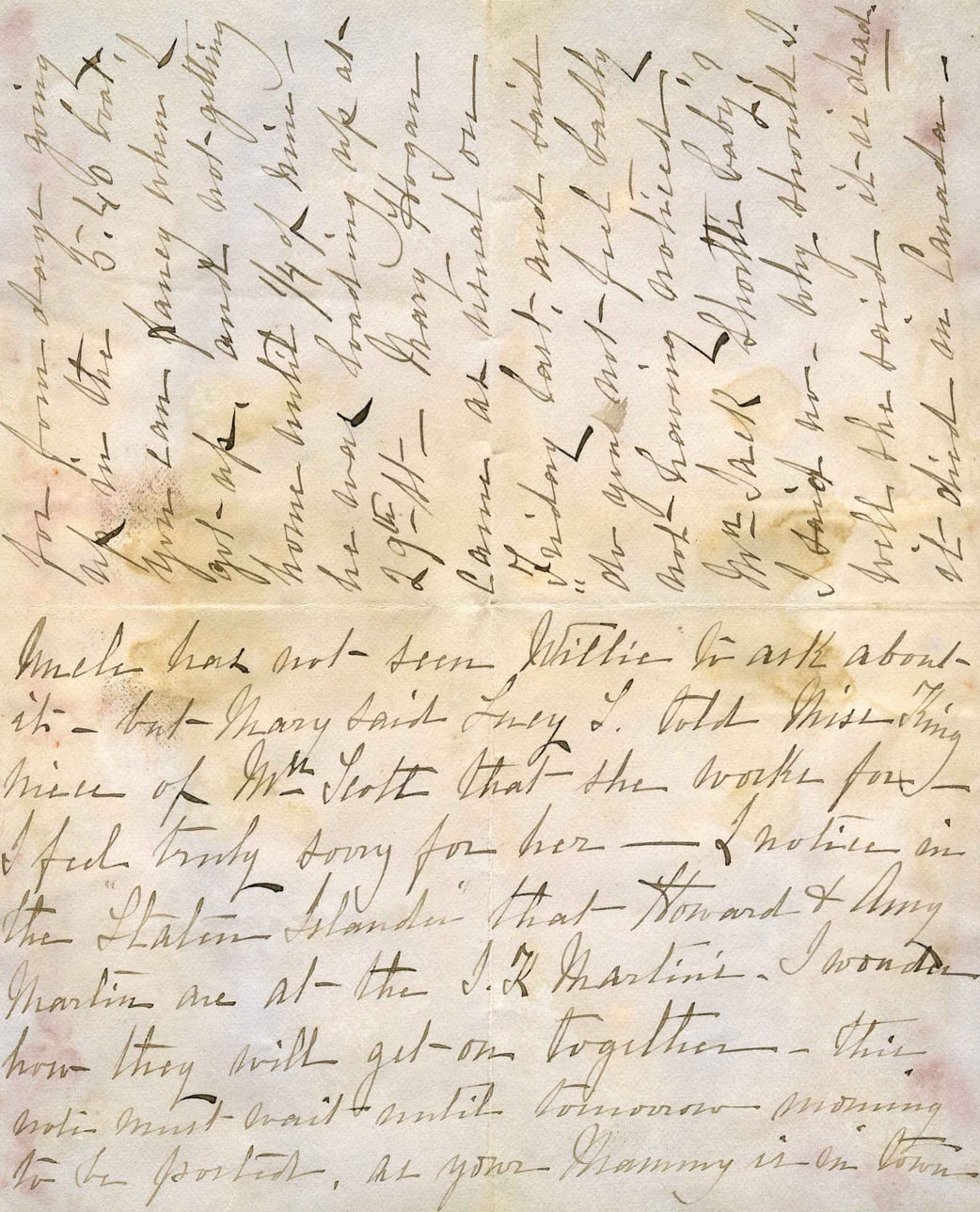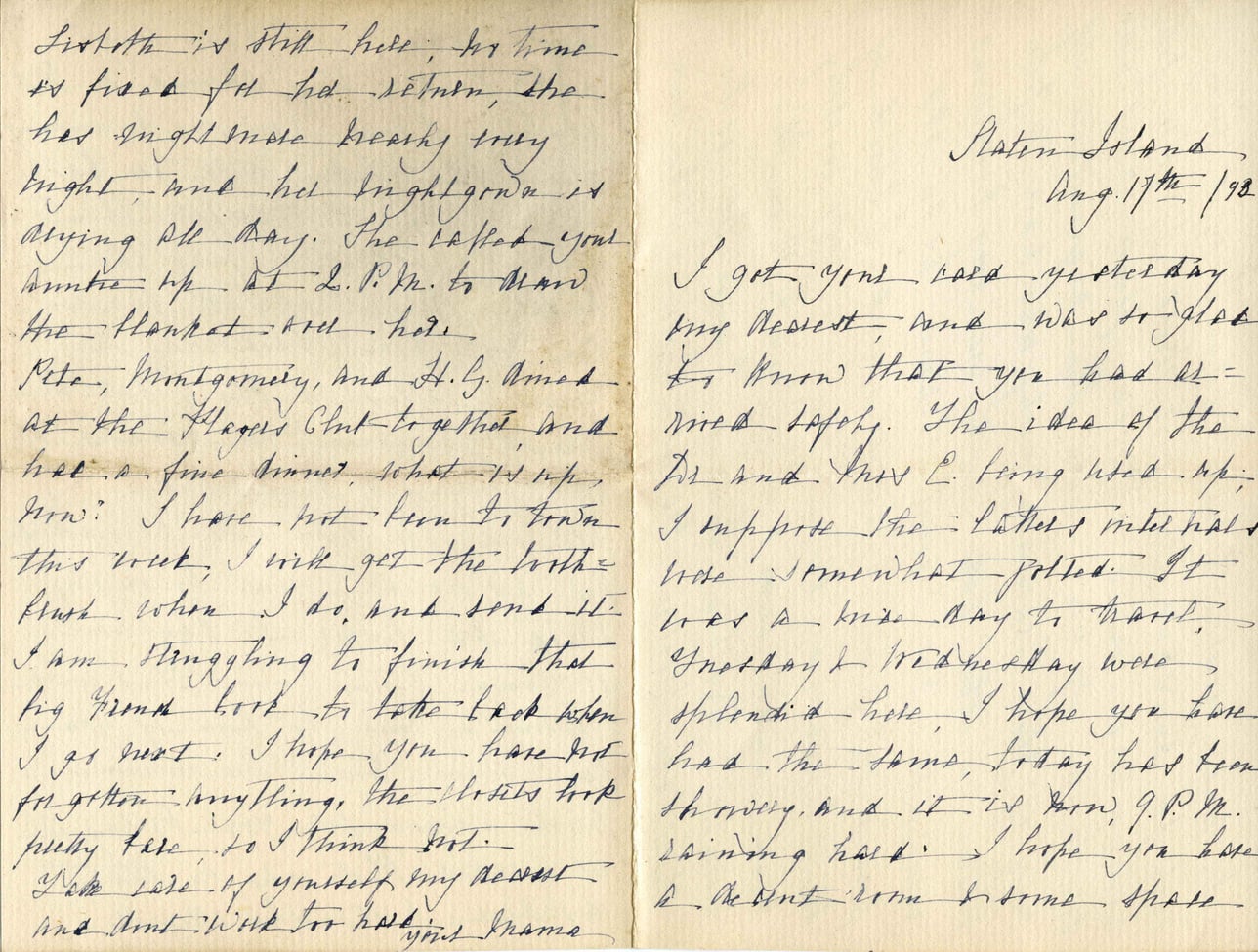 @alice_austen -> family member -> @memaSister is still here, for time is past for her return, she has might more beauty every night, and her nightgown is flying all day. She called your Auntie up at 2 P.M. to send her blankets &c. here. Pete, Montgomery, and H.G. Ames at the Players Club to get hot, and has a fine dinner. What is up, now? I have not been to town this week, I will get the tooth paste when I do, and send it. I am struggling to finish that fig friend book to take back when I go next. I hope you have not forgotten anything, the closets look pretty bare, so I think not. Take care of yourself my dearest one, don't wish too hard. Your Mama Staten Island Aug. 17th /98 I got your card yesterday by express, and was so glad to know that you had arrived safely. The idea of the Dr. and Mrs. C. being held up; I suppose the latter's mittens were somewhat jotted. It was a nice day to travel. Yesterday & Wednesday were splendid here. I hope you have had the same, today has been snowy, and it is now, 9 P.M. snowing hard. I hope you have a decent room & some space.