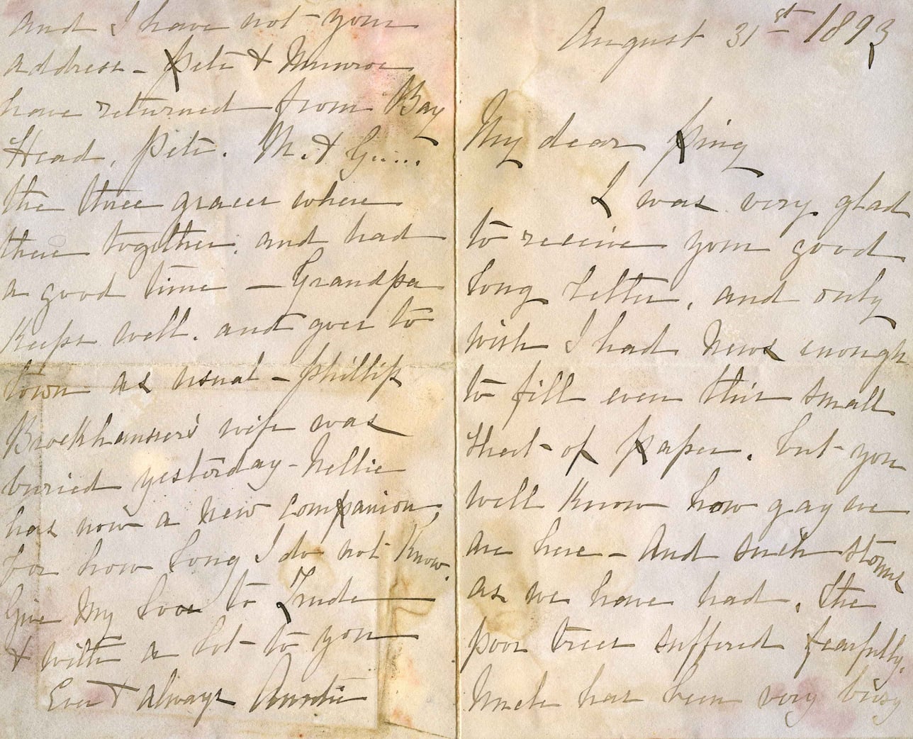 And I have not your address. Pete & Simmons have returned from Bay Head, N.J. The three graces where there together and had a good time—Grandpa keeps well and goes to town as usual—Phillip Brockhamond's wife was buried yesterday—Hollie has now a new companion, for how long I do not know. Give my love to Linda & with a lot to you. Ever & always, Annie August 31st, 1893 My dear Ping, I was very glad to receive your good long letter, and only wish I had room enough to fill even this small sheet of paper. But you will know how gay we are here—and such storms as we have had. The poor tree suffered fearfully. Imke has been very busy.