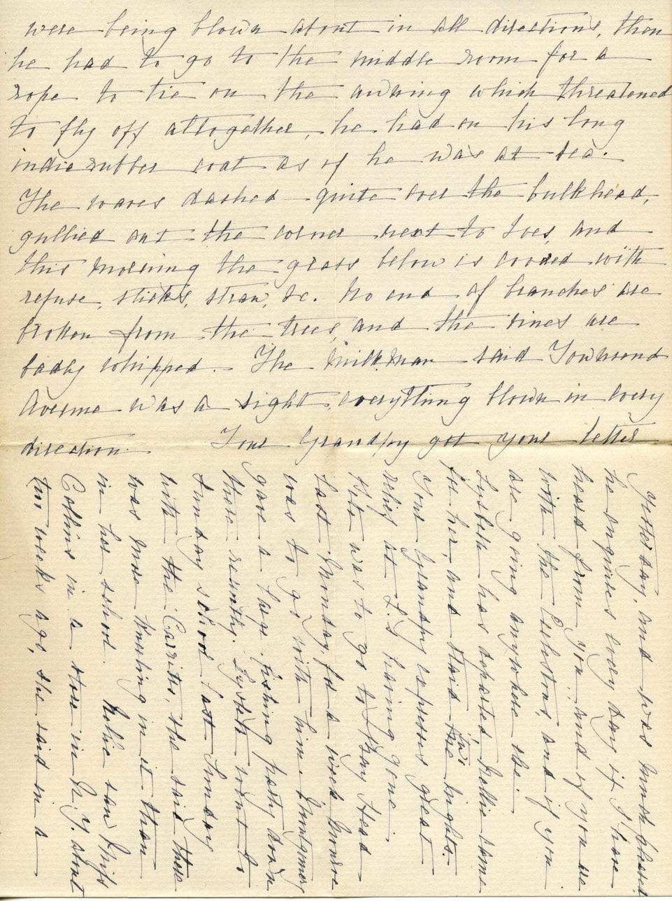 were being blown about in all directions, then he had to go to the middle room for a rope to tie on the awning which threatened to fly off altogether. He had on his long indigo butter coat as if he was at sea. The waves dashed quite over the bulkheads, gushed out the corner next to Joe's bed. This morning the grass below is covered with refuse, sticks, straw, etc. No end of branches are broken from the trees and the vines are badly stripped. The milkman said Tomlinson's house was a sight everything blown in every direction. I'm glad you got your letter yesterday, and I've been blessed no injuries every day if I have heard from you. Kind of you to write the children, and if you are going anywhere the first little has departed. Hello Anna, Mr. Fox, and Miss Fox brought you something unexpected great. Betty & I having gone, Peter was to go to Harry Head last Monday for a week. Montgomery was to go with him. Montgomery gave a large painting party and gave a beauty supply treat. Sunday night last Thursday with the Carrier, she said there was more working in it than in her school. Helen saw Philip Collins in a store in P.J. about two weeks ago, she said in a