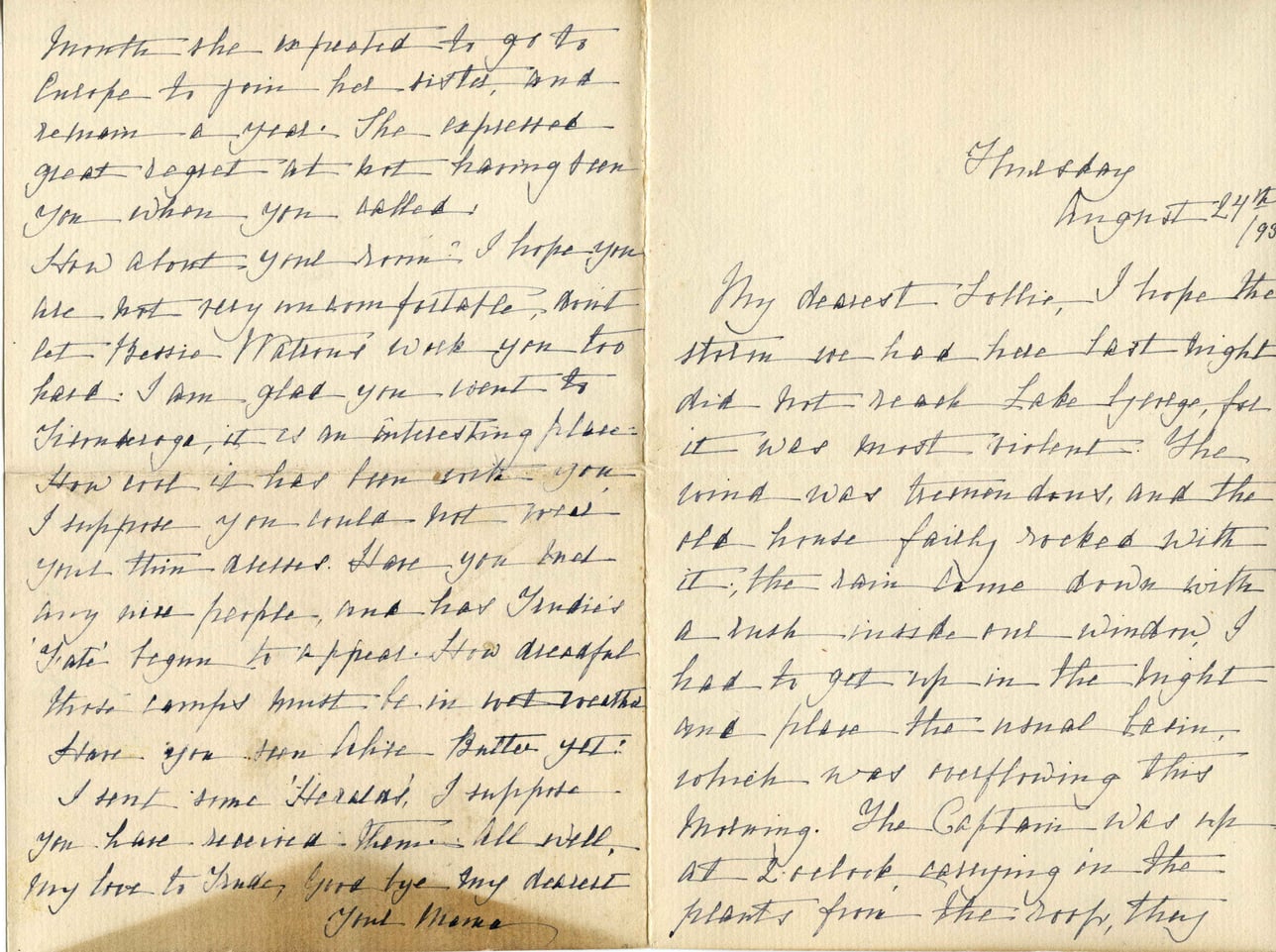 In the month she refused to go to Europe to join her sister, and remain a year. She expressed great regret at not having seen you when you asked. How about your room? I hope you are not very uncomfortable. Don't let Fannie Waters work you too hard. I am glad you went to Tiernaberga; it is an interesting place. How long it has been since you, I suppose, you could not send your thin letters. Have you had any nice people, and has Freddie's "Fat" begun to appear. How dreadful these lamps must be in wet weather. Have you seen Albert Butler yet? I sent some Herald's, I suppose you have received them. All well. My love to Trude, yours etc. My dearest Yours Mema Thursday August 24th 1930 My dearest Lollie, I hope the storm we had here last night did not reach Lake George, for it was most violent. The wind was tremendous, and the old house fairly rocked with it; the rain came down with a rush inside one window. I had to get up in the night and close the usual leak, which was overflowing this morning. The Captain was up at 2 o'clock, carrying in the plants from the deep, they