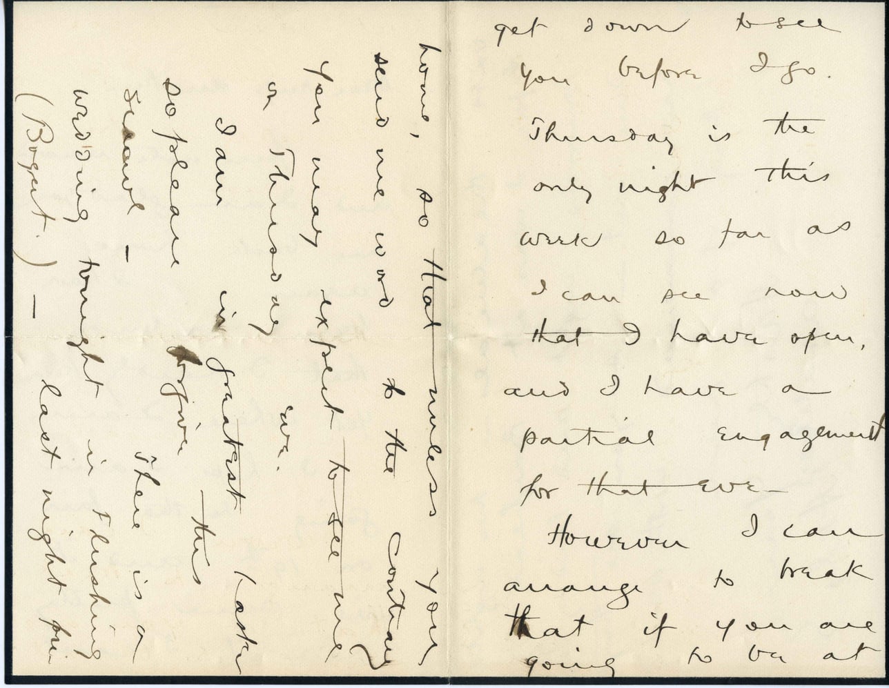 home, so that unless you send me word to the contrary you may expect to see me on Thursday evening. I am in great fear I am to leave this town if there is a meeting tonight in Flushing (Brookt.) - last night you get down to see you before I go. Thursday is the only night this week so far as I can see now that I have open, and I have a partial engagement for that evening. However I can arrange to break that if you are going to be at