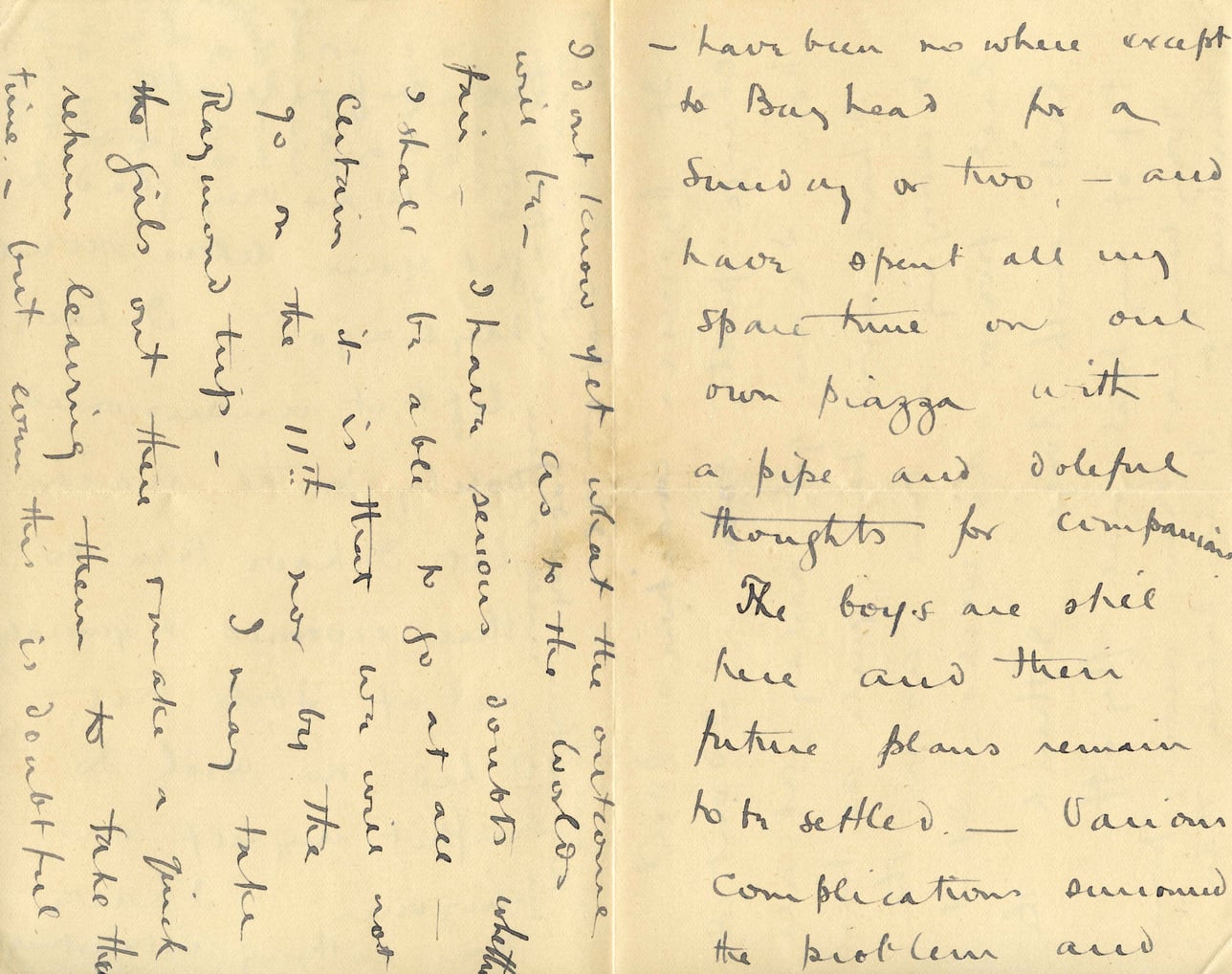 I don't know yet what the outcome will be— as to the world's fair—I have serious doubts whether I shall be able to go at all— certain it is that Mr. Will was not going on the 11th nor by the Rangoon trip— the girls went there & made a quick return leaving them to take their time—but even this is doubtful. —have been no where except to Bay head for a Sunday or two—and have spent all my spare time on our own piazza with a pipe and doleful thoughts for companions. The boys are still here and their future plans remain to be settled.—Various complications surround the problem and