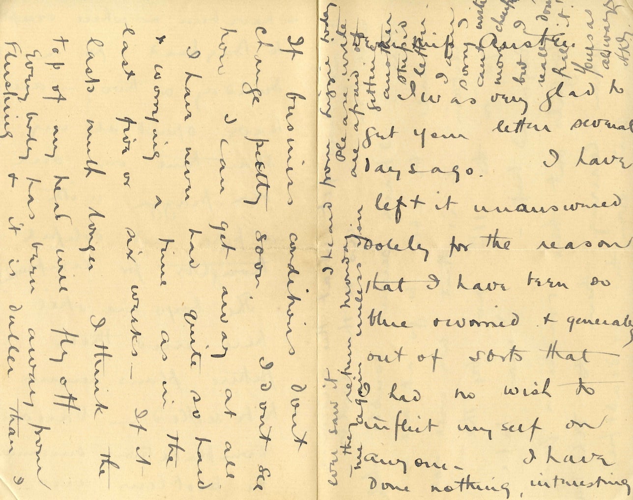 If brownie conditions don't change pretty soon, I can get away at all. I have never had quite so hard times as in the last year or six weeks—& it last month longer & think the top of my head will fly off when I have been away from finishing & it is drier than ever saw it before today! People are writing the return message in the request answers. I am afraid the setting is not good & I was very glad to get your letter several days ago. I have left it unanswered solely for the reason that I have been so thee overworked & generally out of sorts that had no wish to inflict myself on anyone. I have done nothing interesting