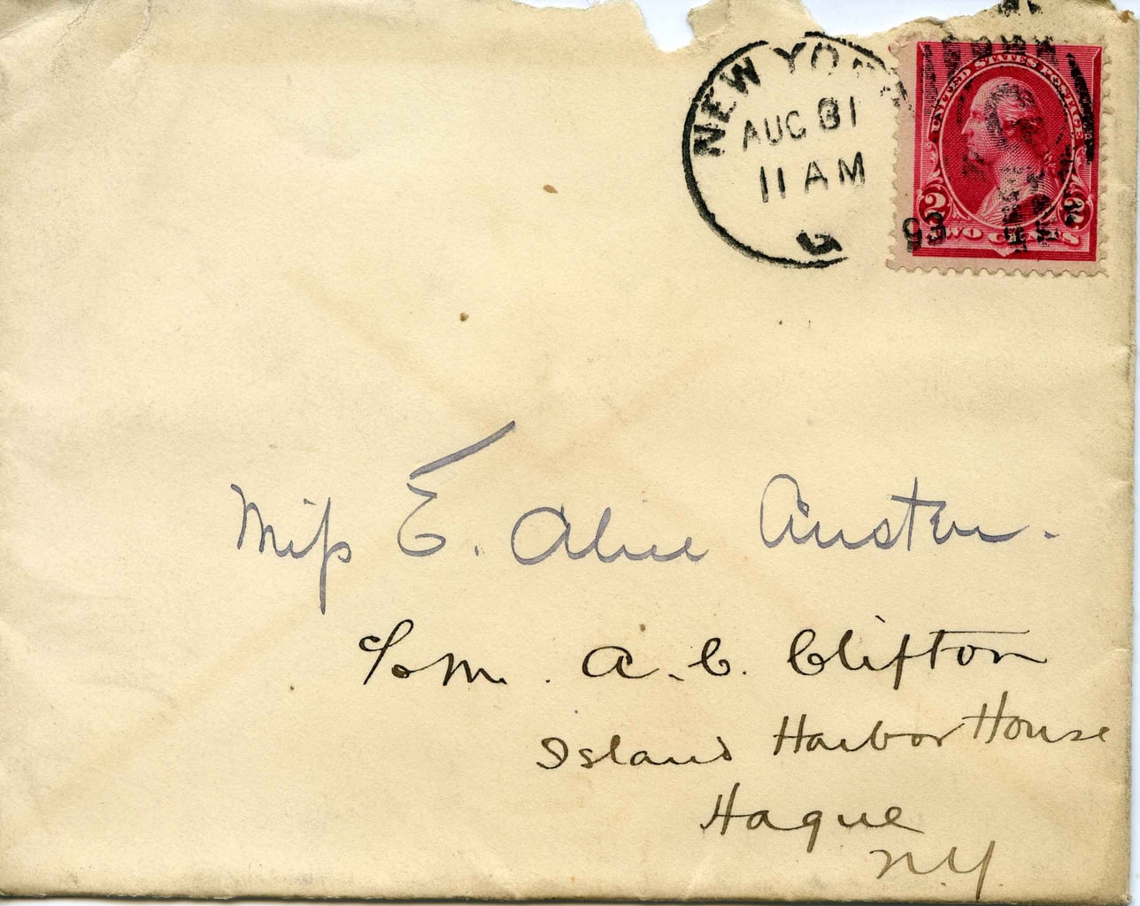 @letter_1893_09_12_1003 -> proposes -> {meeting: "Thursday evening"} {when: @date_1893_09_12}Miss E. Alice Austin Com. A.B. Clifton Island Harbor House Hague NY