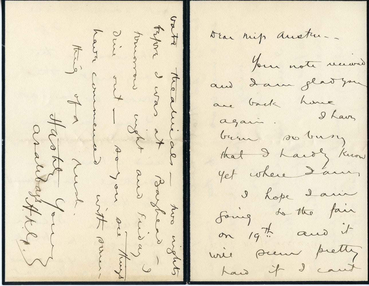 Dear Miss Austin— Your note received and I am glad you are back here again. I have been so busy that I hardly know yet where I am. I hope I am going to the fair on 19th and it will seem pretty hard if I can't The annuals—two nights before I was at Barsham—and find my tomorrow night things out—I do you no harm commenced with some thing of a rush. Has to go as always.