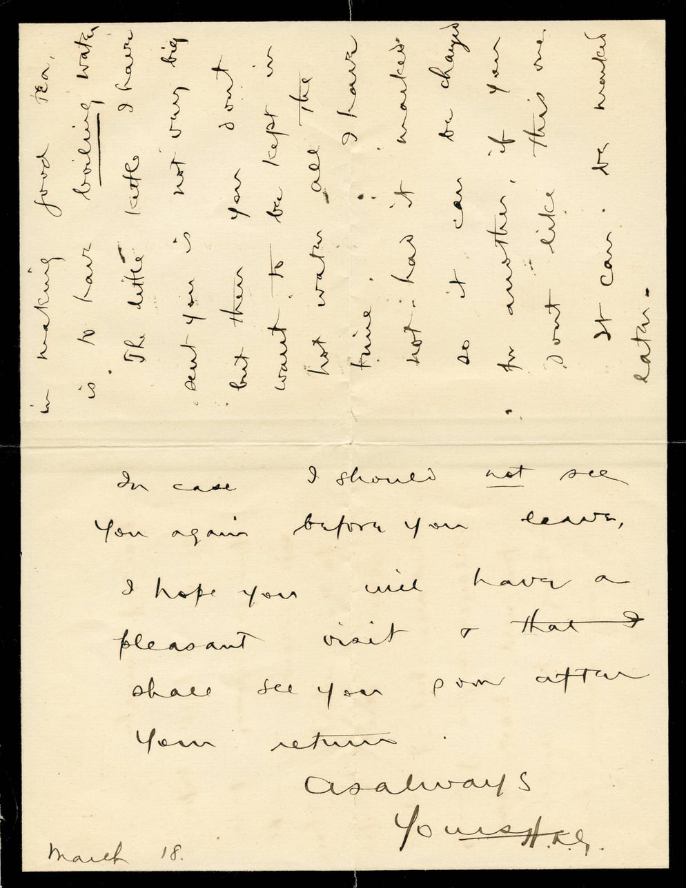 in making food tea. so I have boiling water. JK like kites I have sent you is not very big but then you don't want to be kept in hot water all the time. I have not had it worked so it can be changed for another, if you don't like this one. It can. It would later. In case I should not see you again before you leave, I hope you will have a pleasant visit & that I shall see you soon after your return. As always Yours H.K. March 18.