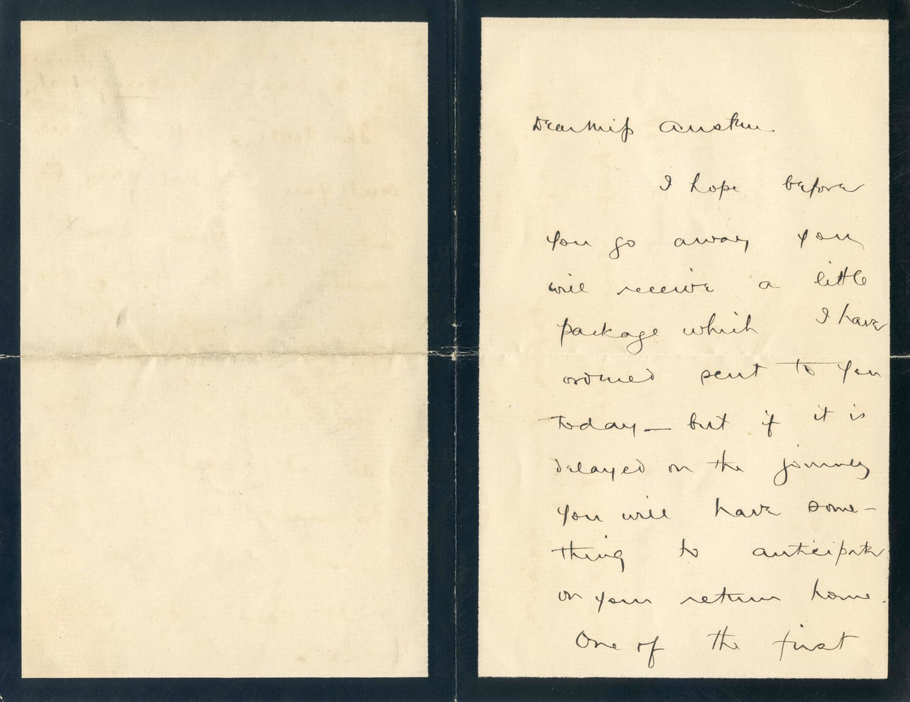 @file_pinax -> documents -> @henry_gilman_correspondenceDear Miss Austin, I hope before you go away you will receive a little package which I have ordered sent to you today—but if it is delayed on the journey you will have something to anticipate on your return home. One of the first