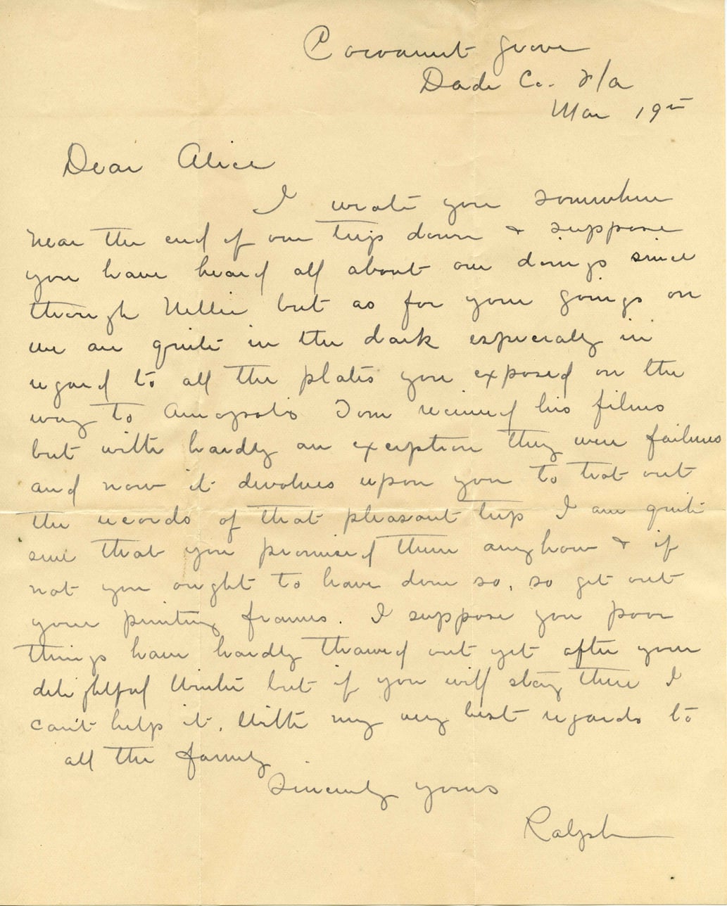 @victorian_era:concept {}Dear Alice, I wrote you somewhere near the end of our trip down & suppose you have heard all about our doings since through Willin but as for your songs on me am quite in the dark especially in regard to all the plates you exposed on the way to An egois I am weary of his films but with hardly an exception they were failures and now it devolves upon you to test out the words of that pleasant trip. I am quite sure that you promise them anyhow & if not you ought to have done so, so get out your painting frames. I suppose you poor things have hardly thawed out yet after your deli helpful winter but if you will stay there I can't help it. With my very best regards to all the family. Sincerely yours, Ralph