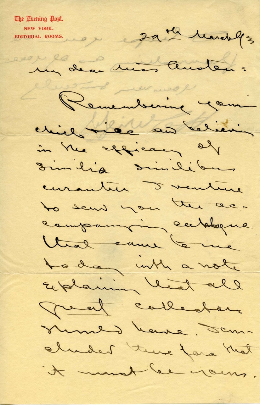 @letter_1893_03_29_wright_to_austen -> sent to -> @alice_austenThe Evening Post. NEW YORK. EDITORIAL ROOMS. 24th March 93 My dear Miss Custer: Remembering your chief view as believing in the efficacy of Similia similibus curantur I venture to send you the accompanying cecilagne that came to me today with a note explaining that all great collectors must have. I concluded there fare that it must be yours.