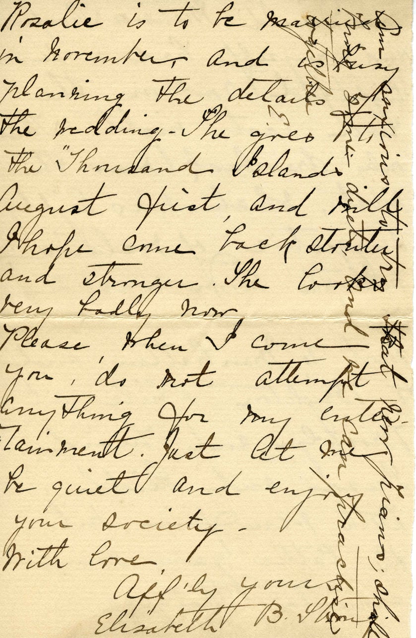 Pozalie is to be married in November and is planning the details of the wedding. She goes to the "Thousand Islands" August first, and will hope come back stronger and stronger. She looks very badly now. Please when I come you do not attempt anything for my entertainment. Just let me be quiet and enjoy your society. With love, Aff'ly yours, Elizabeth B. Stone